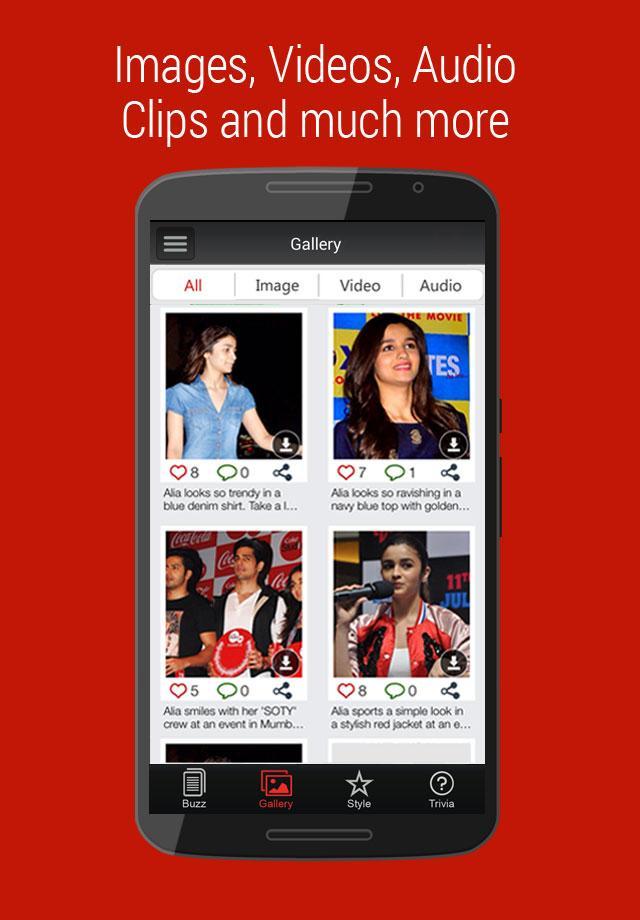 Just download the app and get access to Alia Bhatt’s gallery where you will get to know about Alia Bhatt’s dazzling style and interesting trivia. You will never be away from Alia’s latest bollywood updates as you will get gossips, trivia, videos, and her hot images wherever you are! You will get the freedom to share Alia’s stylish images with your friends and like them too.