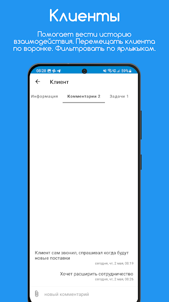 ・Contacts - functionality helps you interact with customers more effectively. If you need additional fields, comments on contacts or tasks, you can add them in a couple of clicks, as well as view call history and conversation recordings