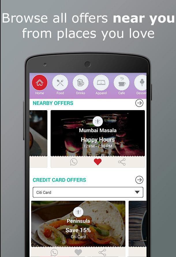 ✔ Find where you can get discounts using your credit/debit cards. We have information on offers available on all bank’s cards including Kotak Offers, SBI Freedom Rewardz, Citi Bank, ICICI Bank, HDFC Bank card and more, so just put your card back in your pocket and head out