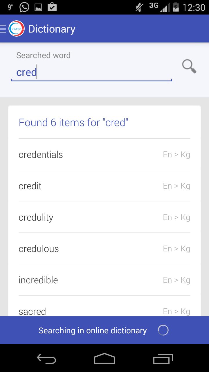 El-Sozduk provides access to the most popular dictionaries of the Kyrgyz language. There are both English-Kyrgyz (more than 8000 of the most frequently used words) and Kyrgyz-English dictionaries (more than 7000 of the most frequently used words) created by T. Abdiev and L. Sydykova. These dictionaries install in device memory. Additionally, the app provides online access to other dictionaries.