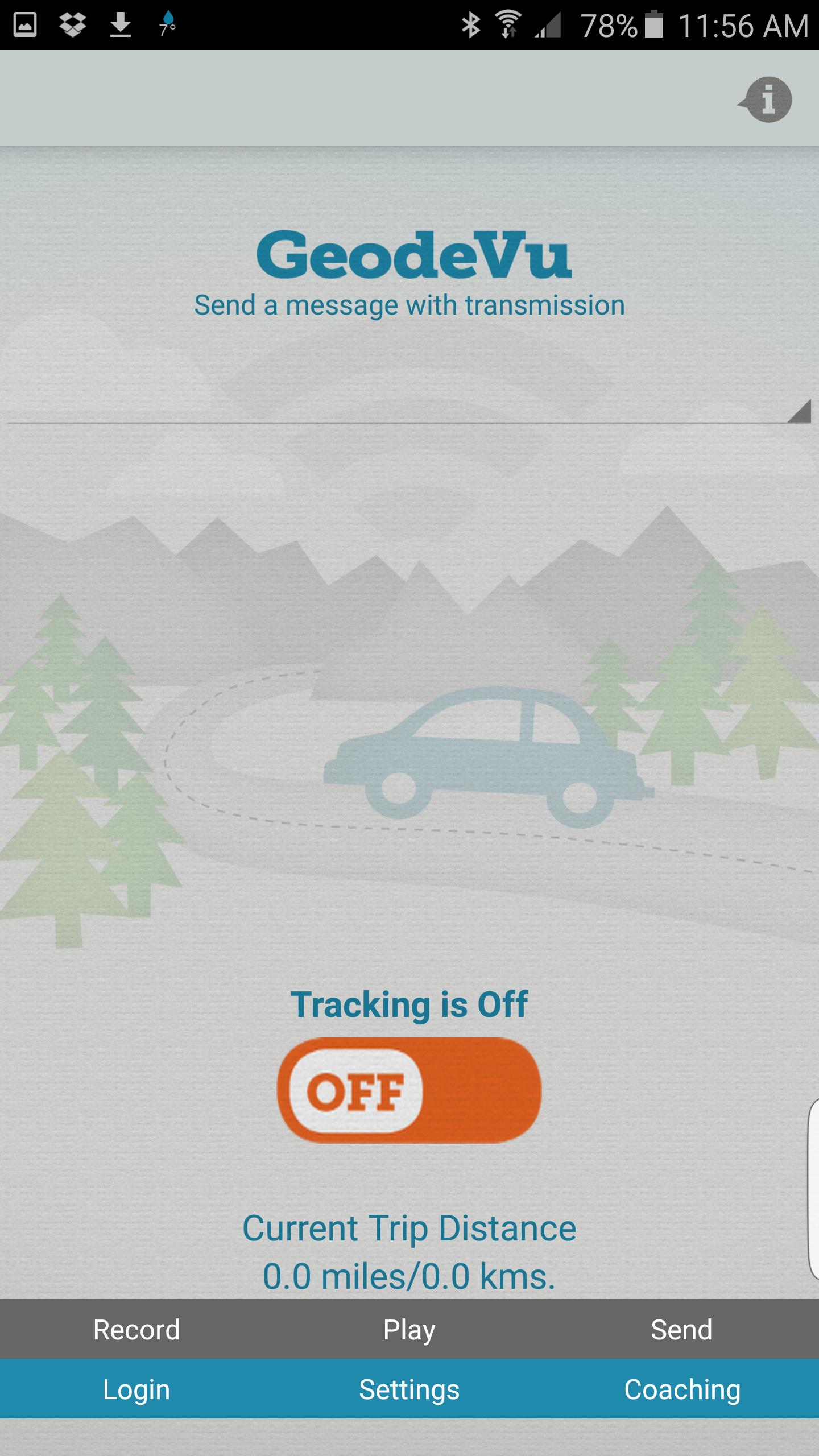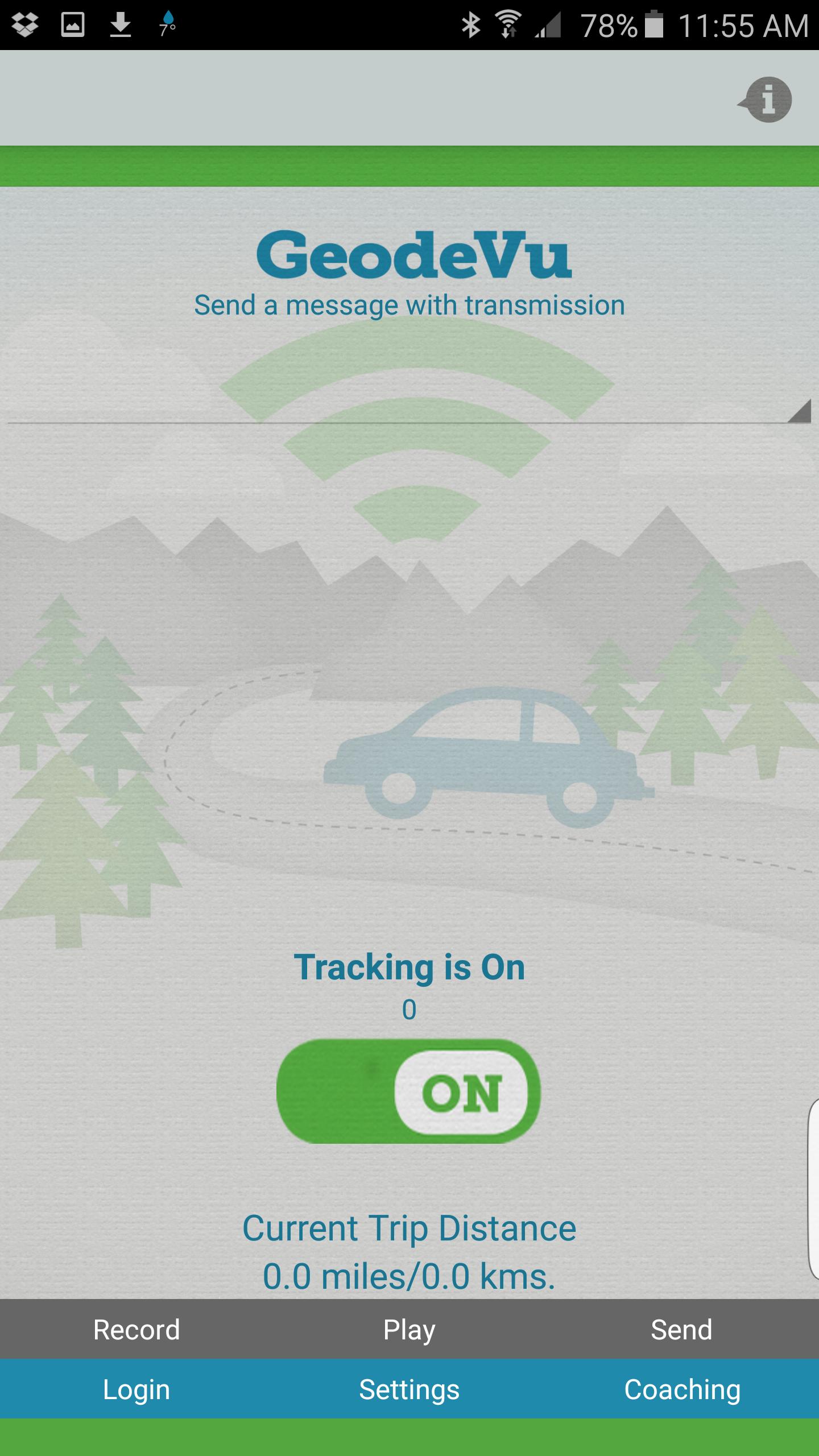 Please note: We make every effort to reduce the power consumption required for continued use of GPS however running GeodeVu can dramatically decrease battery life. To reduce battery consumption you can plug your GeodeVu equipped phone or tablet into a vehicle charger while in tracking mode.