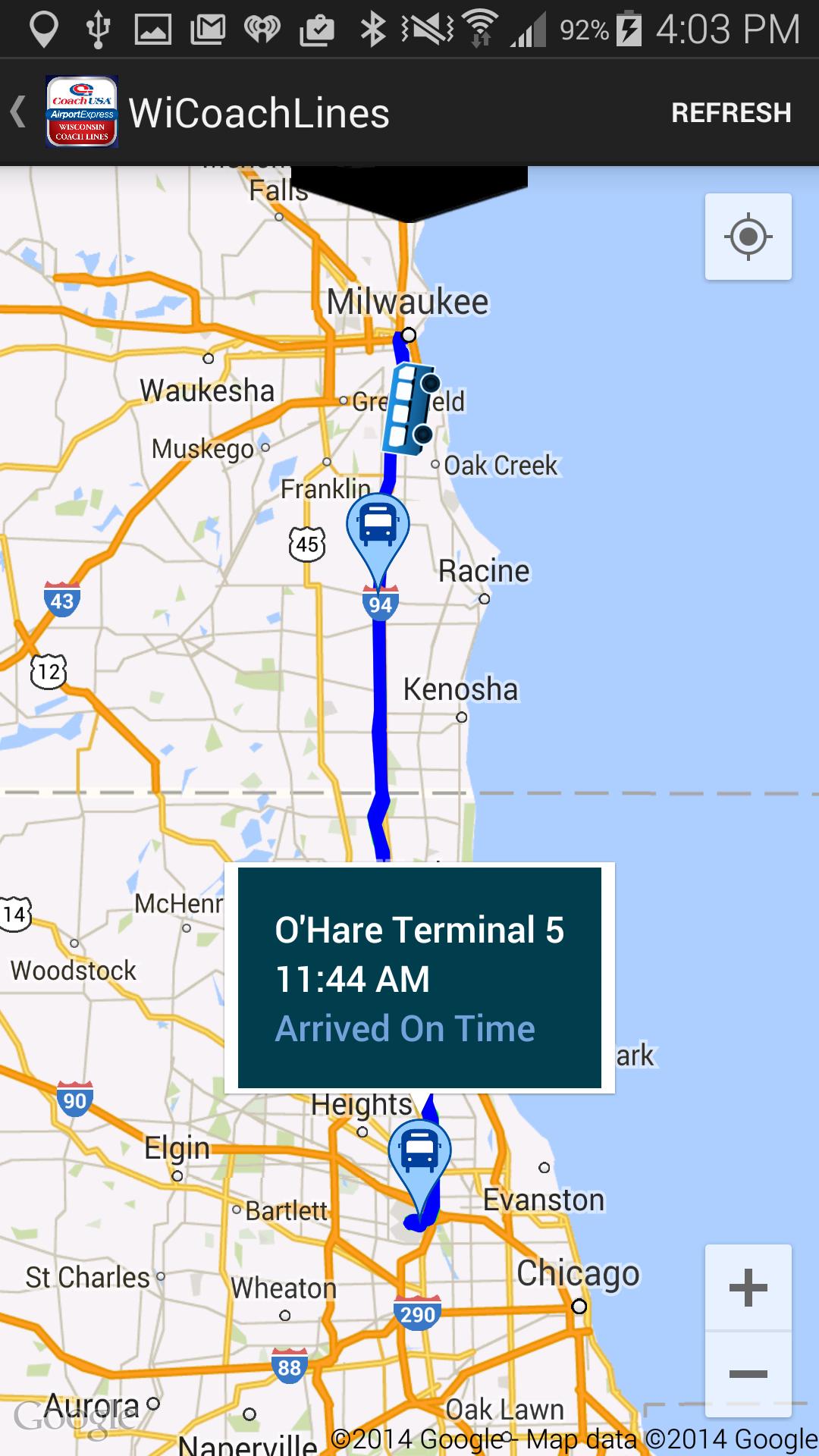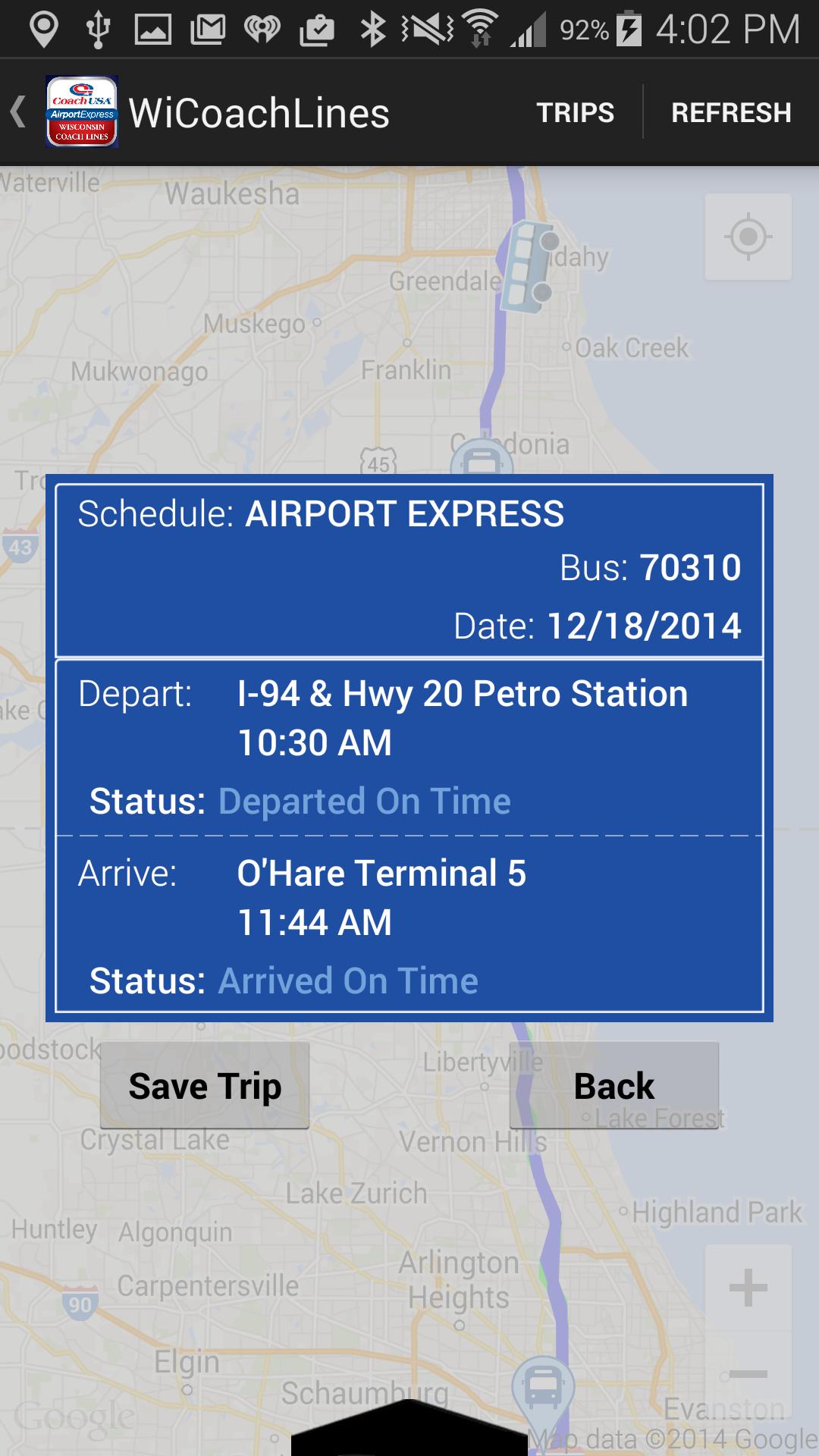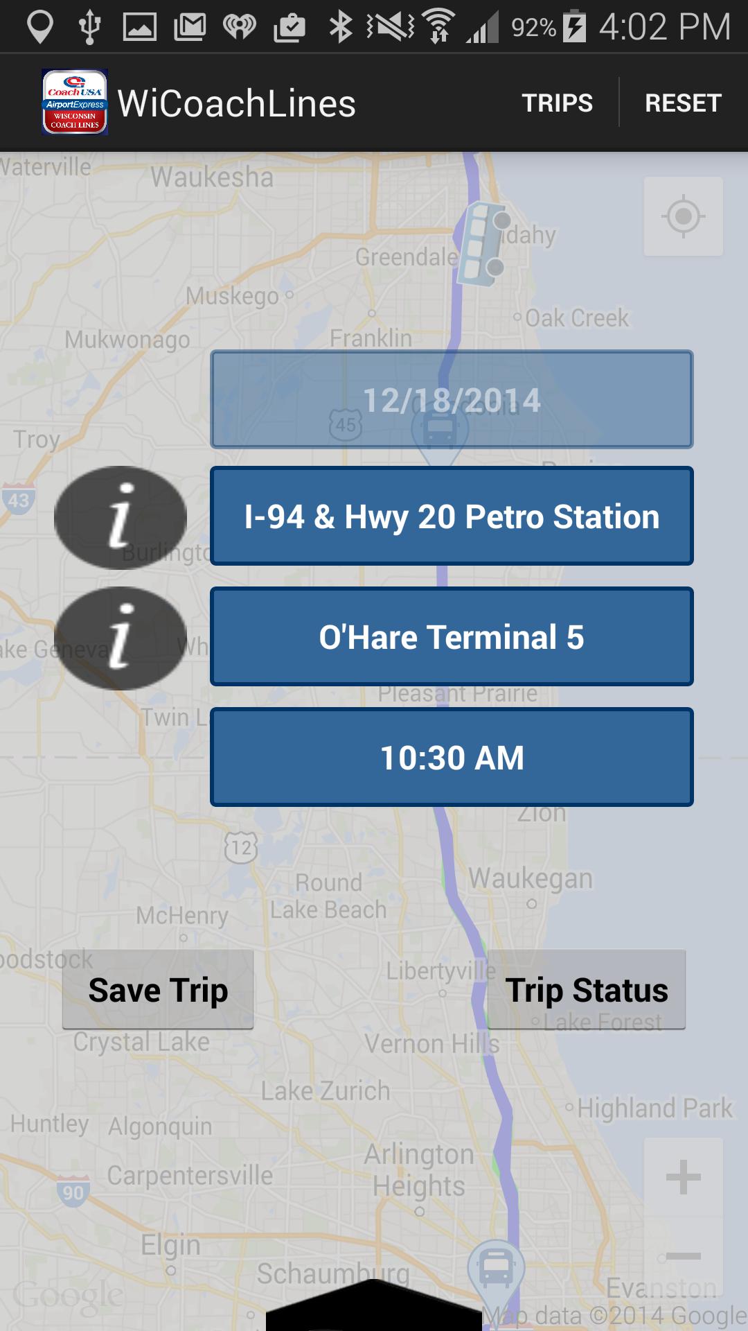 The Wisconsin Coach Lines app is the only official app for tracking your next trip on our Coach USA Airport Express service or our commuter services in southeastern Wisconsin. Enter the details of your trip to find your departure and arrival times. Directions are provided for each stop serviced to ensure you're at the correct location awaiting your bus. The app can save multiple trips scheduled for today. This app presently supports Coach USA Airport Express service between Waukesha, Milwaukee, Racine, Kenosha and Chicago's O'Hare Airport. Waukesha County Express commuter service between Waukesha and Milwaukee Counties and our daily Kenosha/Racine/Milwaukee inter-city commuter service will be added in the future.