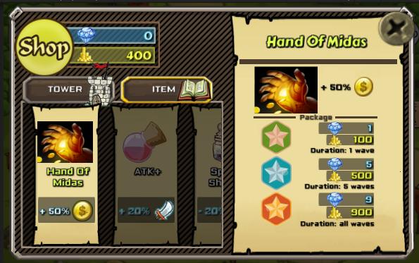 - 5 عناصر للبرج (أيدي Midas ، ATK+، Range+، Spawnshoot+، Tower+)