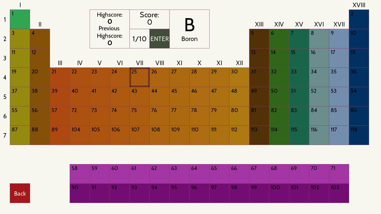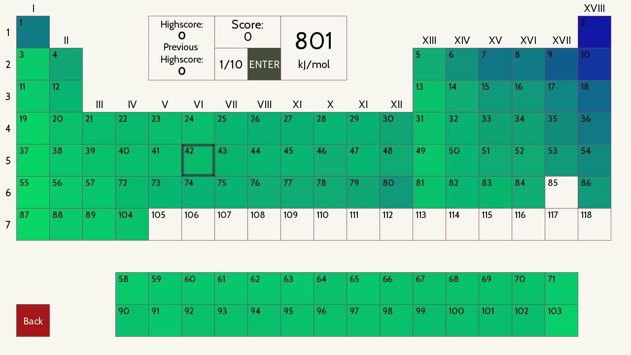 -Gamemoden, um Ionisation, Elektroaffinität, Elektronegativität und Atomradius zu lernen und die Werte anzunehmen.