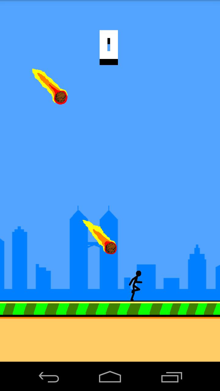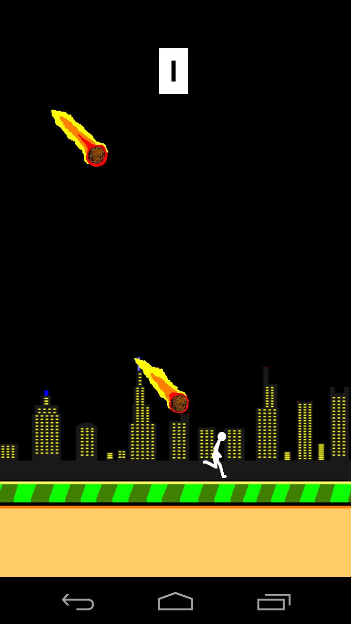 Um ihn zu retten, musst du kontinuierlich auf den Bildschirm tippen, um ihn nach rechts zu bewegen. Lass los, wenn du willst, dass er langsamer wird und nach links gehen. Ihre Aufgabe ist es, den Meteoren auszuweichen. Je mehr Meteore Sie ausweichen, desto höher sind die Punkte. Denken Sie daran, Sie können sich nicht vom Bildschirm bewegen oder Sie werden in Brand gesetzt!