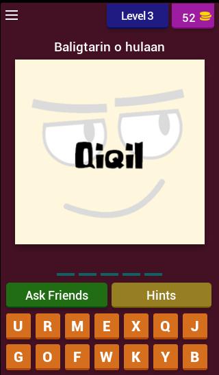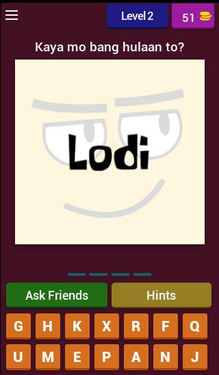 Petmalu, Lodi und andere. Das sehen Sie hier bei PETMALU na Pinoy Slangs . Ratet mal, was das Wort im Spiel bedeutet. Kann entgegengesetzt sein oder es bedeuten. Es macht Spaß und ist einfach zu spielen. Probieren Sie es aus und prüfen Sie, ob Sie alle Levels beenden können.