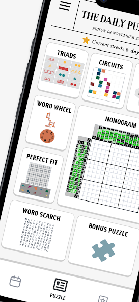 The Daily Puzzle wurde entwickelt und wie eine klassische Zeitung aussieht und bietet jeden Tag eine neue Auswahl an Rätseln, um eine endlose lustige und mentale Stimulation zu gewährleisten. From Nonogram, Sudoku, and Number challenges to Word Wheel, Logic, Triads, IQ Puzzles, and more, there's something here for everyone.