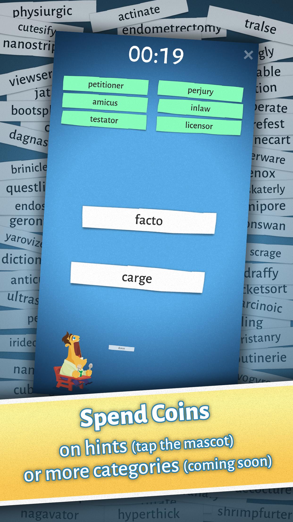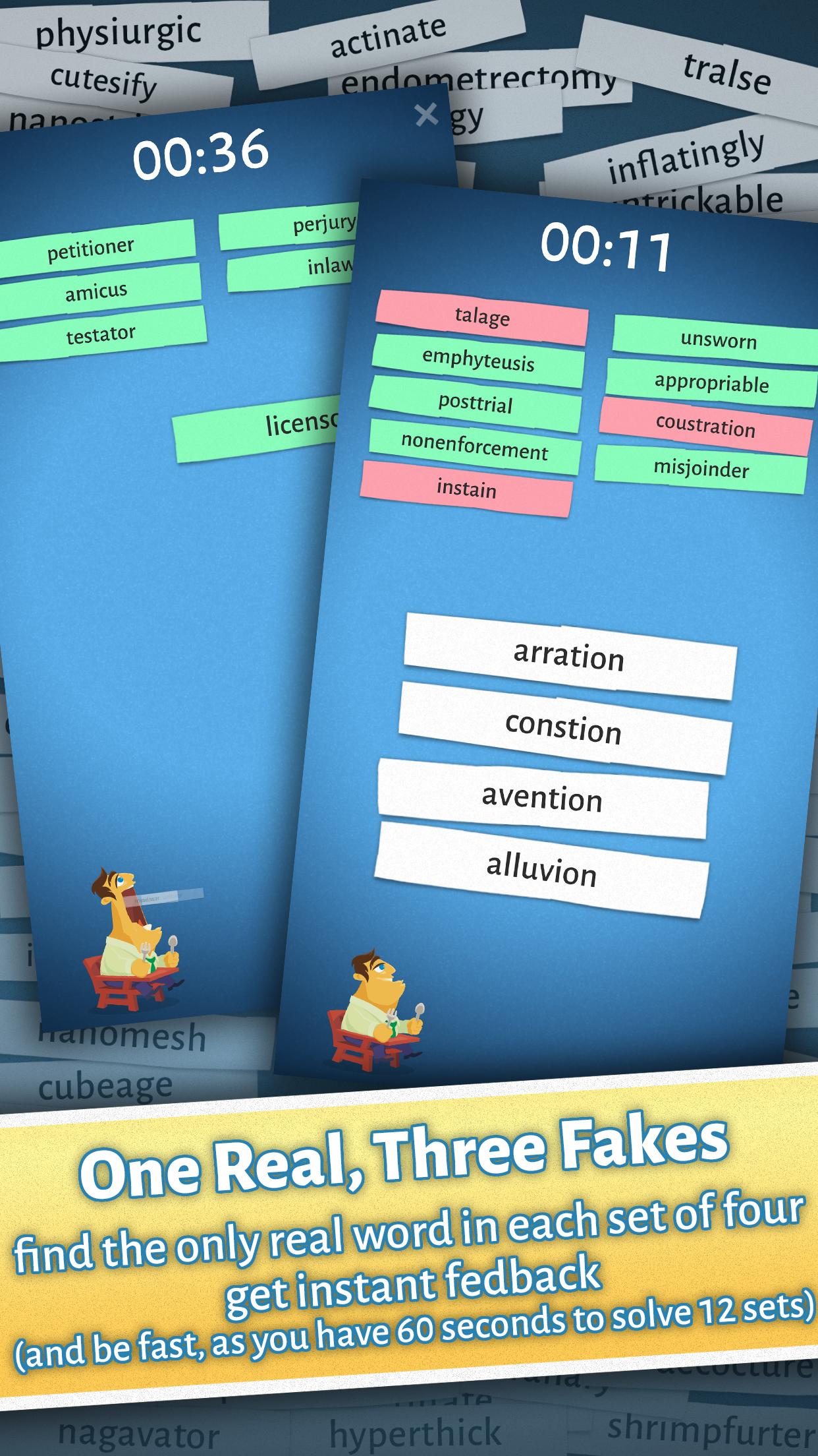Verdivore präsentiert Sie mit vier Wörtern: One Real, drei Fälschungen. Ihr Ziel ist es, das eigentliche Wort in jedem Satz von vier auszuwählen. Nachdem Sie eine Runde von zwölf Sätzen beendet haben, können Sie lernen, was die Wörter bedeuten, und Sie können die wirklichen Wörter aufzeigen, wenn Sie eine gefälschte Auswahl ausgewählt haben. Wörter sind in thematischen Kategorien wie Recht, Musik, Astronomie oder Mathematik und viele andere gruppiert. Wir haben mehr als 150 Kategorien, um Sie über die Grenzen Ihrer Englischkenntnisse zu bringen.