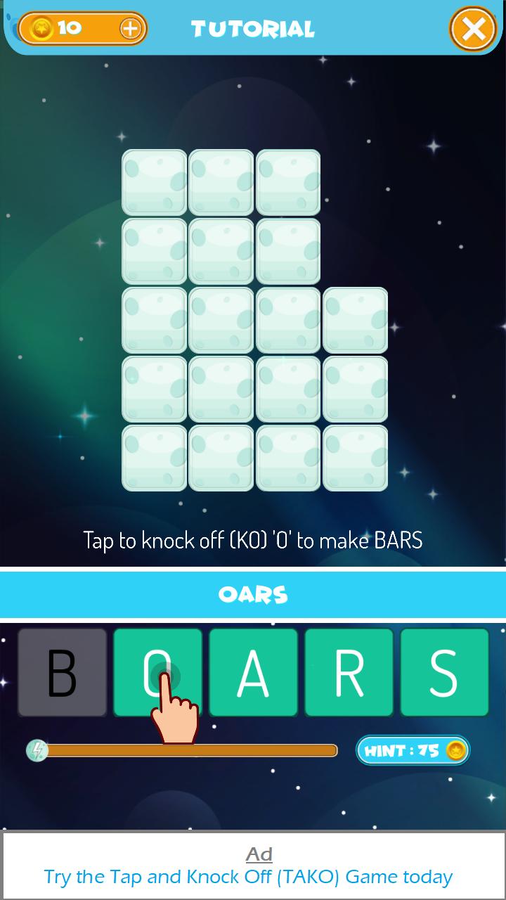 Im Spiel der Tap and Knock Off (Tako) - Das Spiel der Serie 5 dreht sich alles um Worte. Das Ziel des Spiels ist es, eine Reihe von Wörtern aus einem bestimmten Wort zu erstellen, indem sie Buchstaben abklopfen.