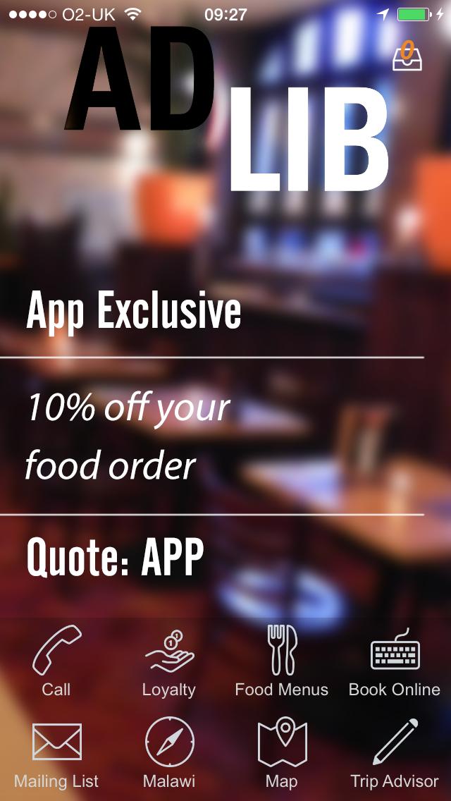 Manténgase al día con todos los eventos y ofertas de lealtad especiales en Ad Lib Bar and Restaurant en Glasgow. Actualizado con ofertas exclusivas cada mes que no querrá perderse. Llame directamente desde la aplicación para reservar su mesa favorita, navegar por nuestros menús o registrarse en Facebook y Twitter.