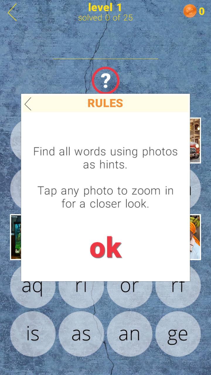 Una palabra por foto. 25 palabras por nivel. 650 Words en el juego. ¿Puedes encontrarlos todos? A veces tienes que pensar más allá de lo obvio. ¡Buena suerte!