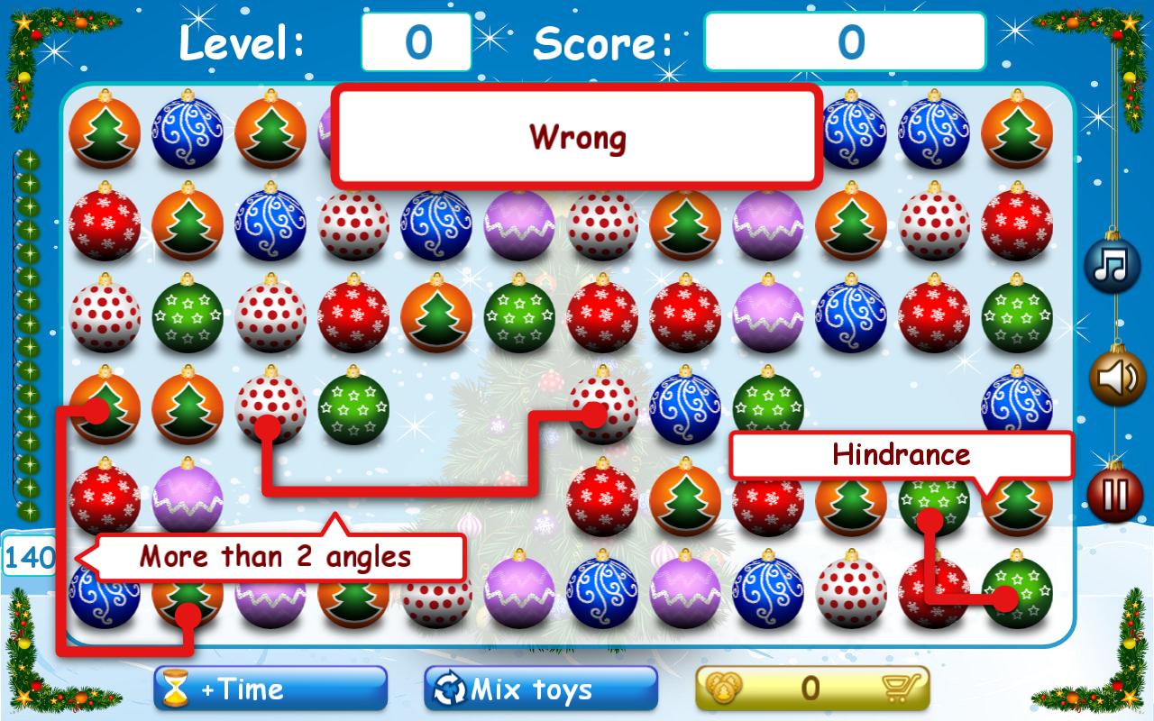 Cada siguiente nivel se complica por el cambio en el campo de juego después de cada movimiento (las bolas de los árboles de Navidad se derraman hacia abajo, hacia arriba, en el centro, etc.).