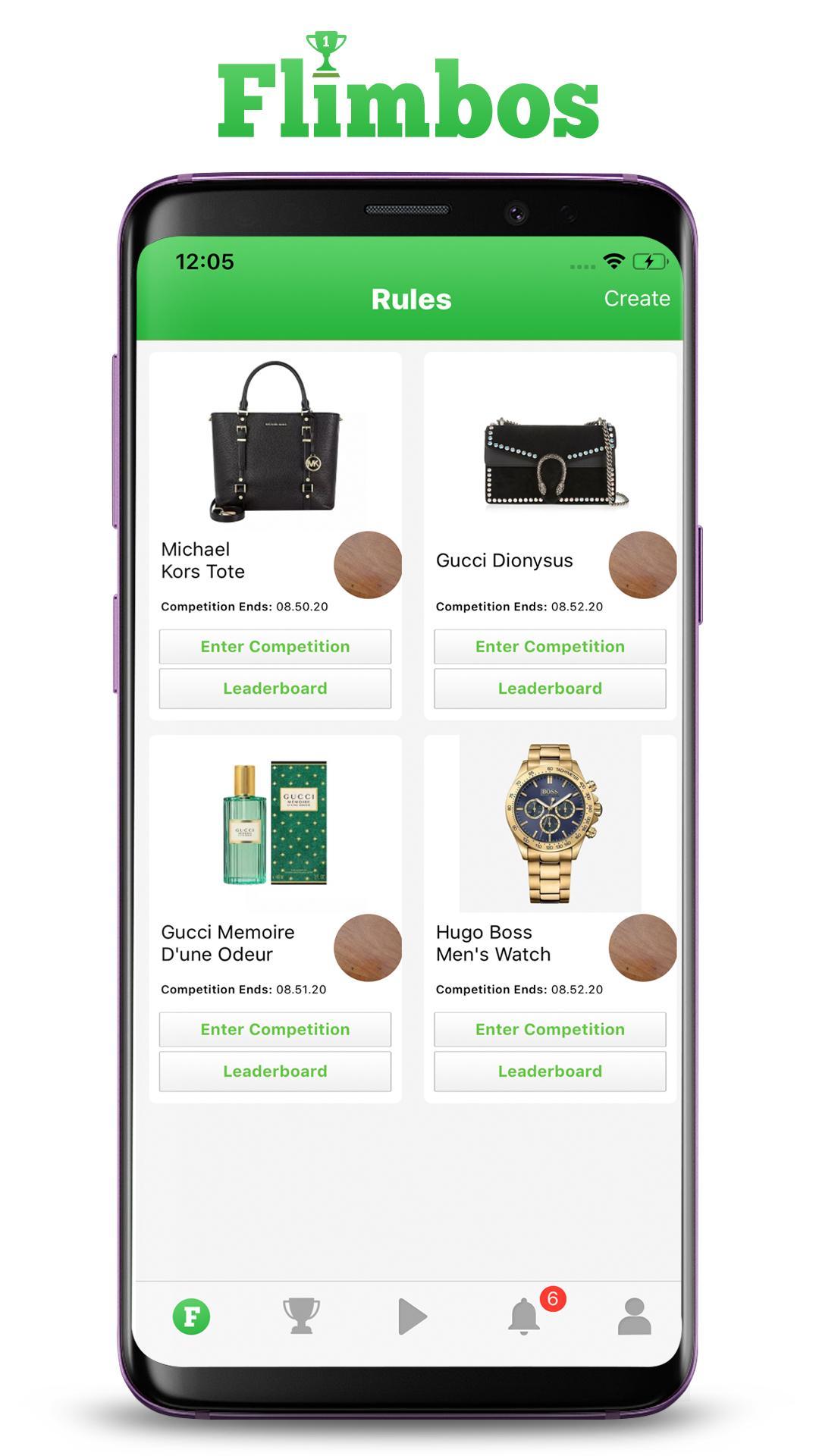 Flimbos es un juego de entrada gratuito donde los usuarios juegan para ganar hermosos artículos de moda. No hay juego ni dinero intercambiado en esta aplicación. Regístrese, cree una cuenta y comience a jugar el juego Flimbos para productos hermosos hoy. Todos los usuarios son libres de ingresar a cualquier competencia y el usuario que termina en el primer lugar en la competencia finalizará el producto para la competencia enviada a su puerta ".