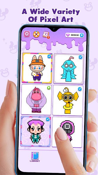 ? Una amplia variedad de imágenes de arte de píxeles para colorear, incluidos animales, vehículos, comida y más. En particular, los personajes familiares como los monstruos azules, los monstruos de payasos, los monstruos de gato sonrientes y las princesas ... están presentes en este juego de arte.