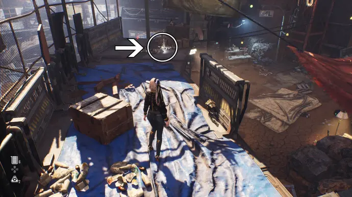 Cuando llegue a la torre, diríjase a través de la puerta abierta y debería ver una pila de contenedores de envío directamente frente a usted contra la pared.