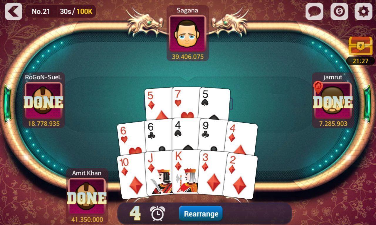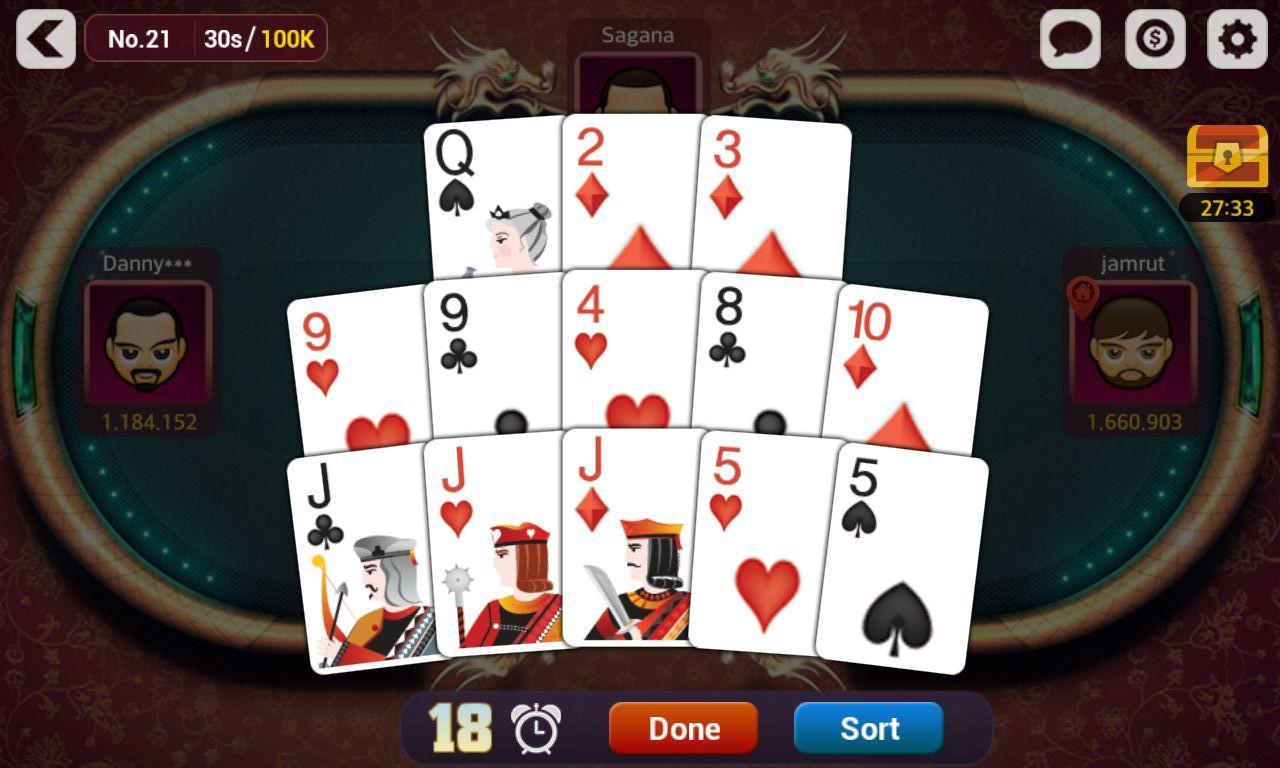Il peut y avoir deux, trois ou quatre joueurs à jouer dans la pièce. Chaque joueur reçoit 13 cartes sur le jeu de 52 cartes et personne ne connaît les cartes des autres jusqu'à ce qu'elle soit présentée. Chaque joueur aura 30 ou 60 secondes pour organiser des cartes en main dans 3 mains de poker: avant, intermédiaire et arrière. Le frontal comprend 3 cartes, en attendant le milieu et l'arrière, chacun a 5 cartes. La règle de l'arrangement est la main de dos est plus forte que la main moyenne et la main moyenne est plus forte que la main frontale. La résistance est déterminée par les règles de la main du poker: Flush Straight> Four Of A Kind > Full House> Flush> droite> trois en type> Deux paires> une paire> Carte haute.