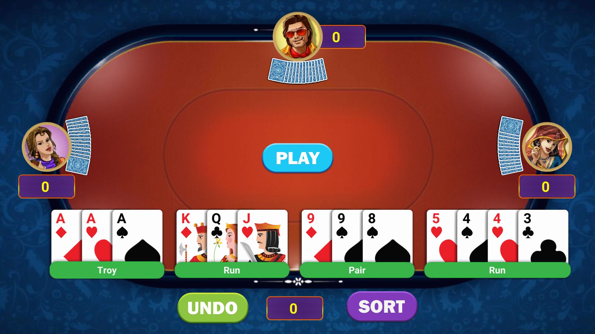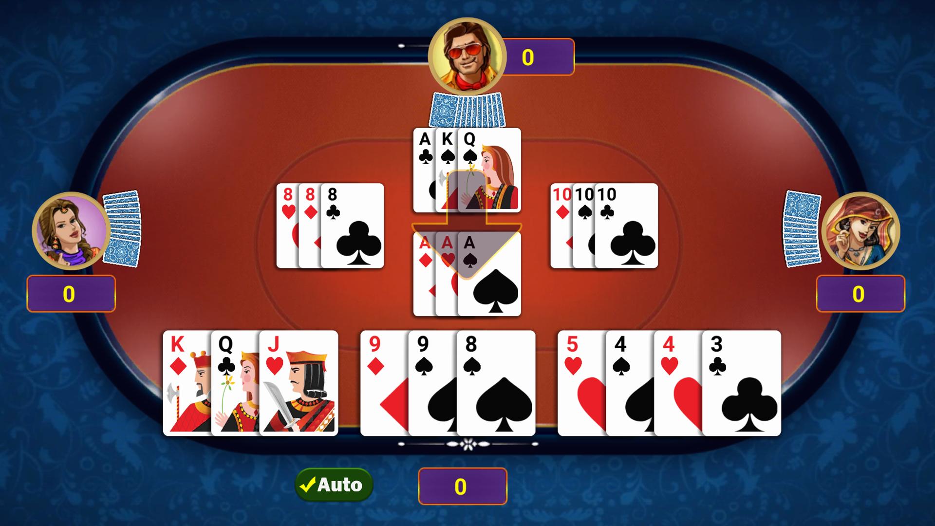 À Hazari, vous obtenez 13 cartes au début de chaque tour. Vous devez diviser vos cartes en 4 mains de 3-3-3-4.