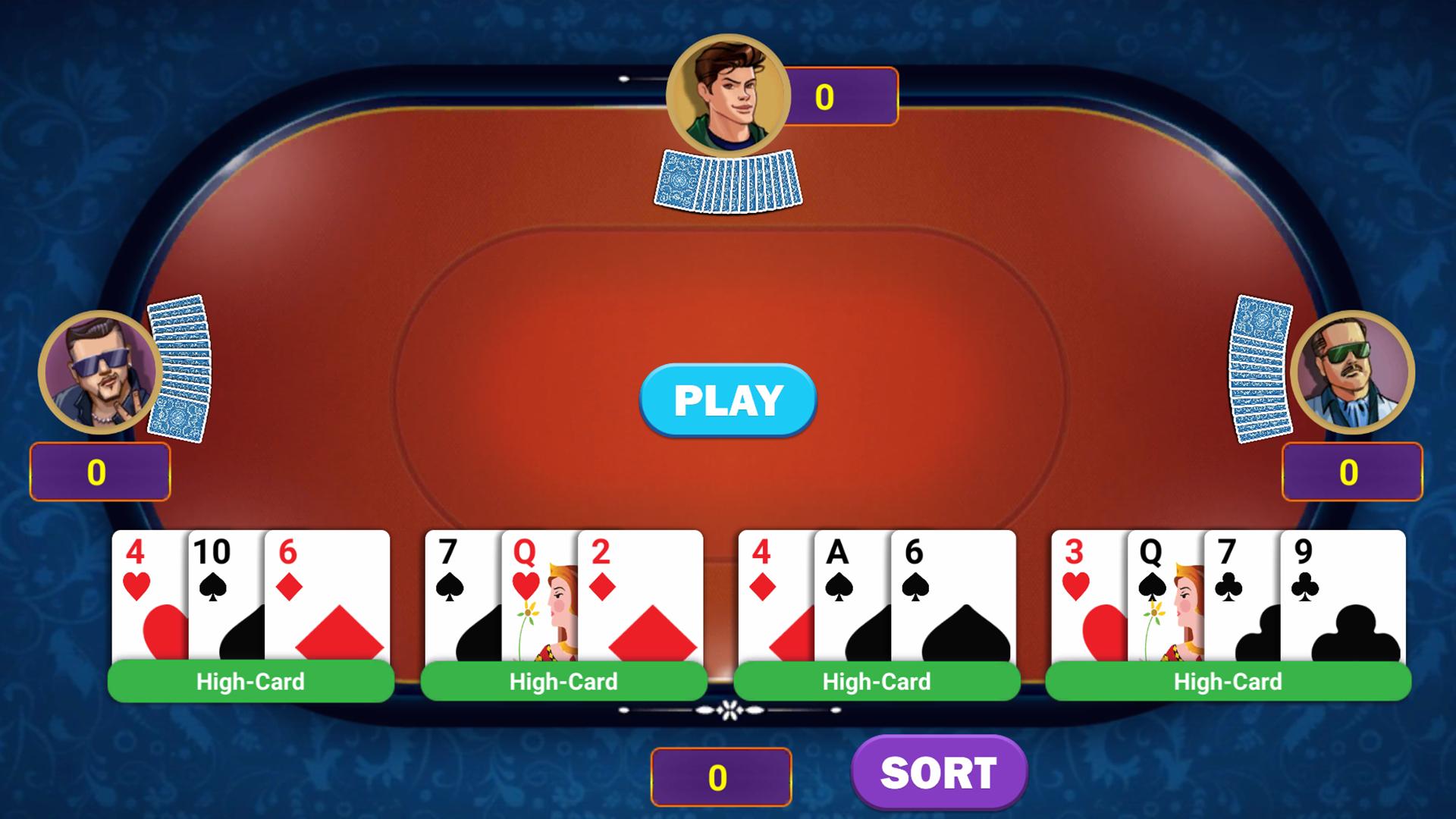 Tous les joueurs doivent d'abord jouer leur meilleure combinaison. Celui avec la meilleure main gagne la main. Celui qui gagne les mains recueille tout point des 12 cartes. A, K, Q, J, 10 ont 10 points chacun et 2 à 9 cartes ont 5 points chacune. De même, la deuxième et la troisième main se jouent. Au quatrième et dernier tour, vous jouez les quatre dernières cartes, composées des plus faibles de leurs groupes à 3 cartes plus une carte de rechange. Le gagnant de ce tour final prend les 16 cartes.