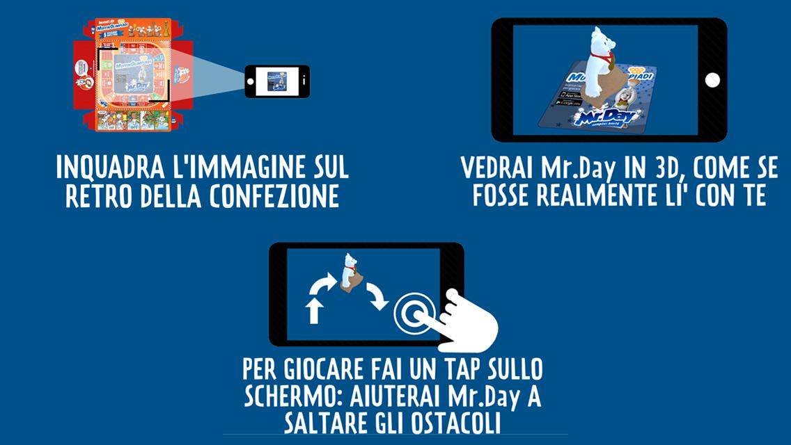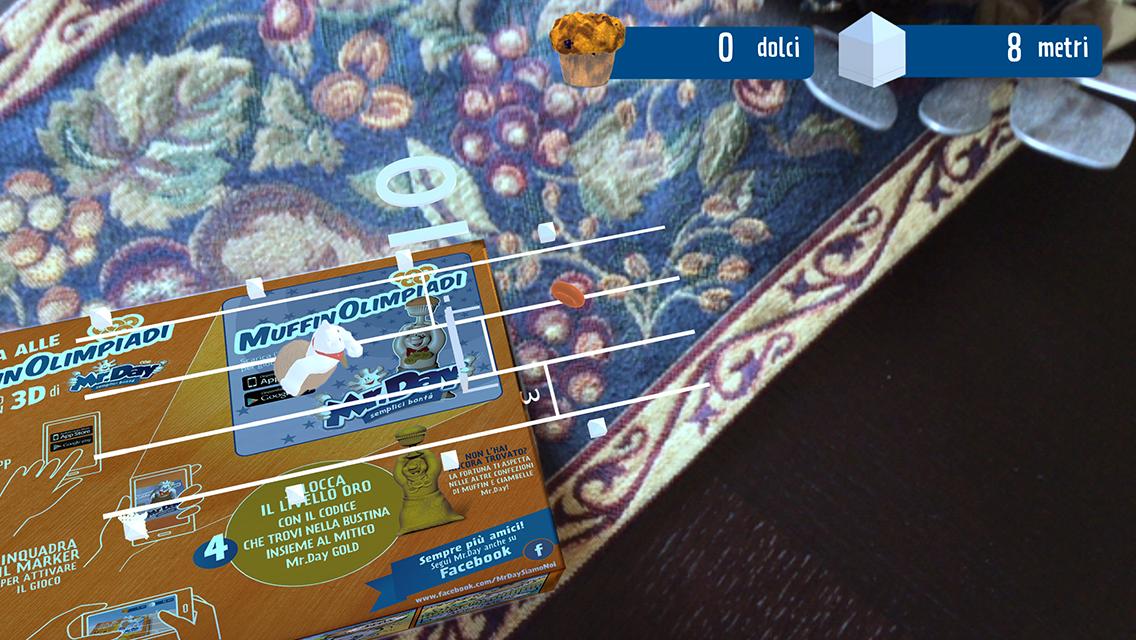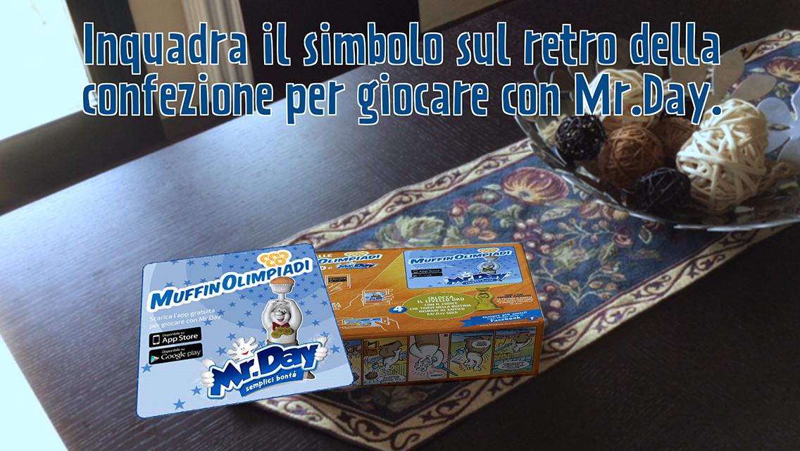 Bienvenue dans le monde de Mrday, où l'image du personnage imprimé au dos des packs des collations de Mr.Day Day devient un jeu interactif grâce à la puissance de la réalité augmentée. Il encadre la silhouette et aide Mrday à gagner le Muffinolimpiadi: sauter pour éviter les obstacles et ne pas manquer un muffin.