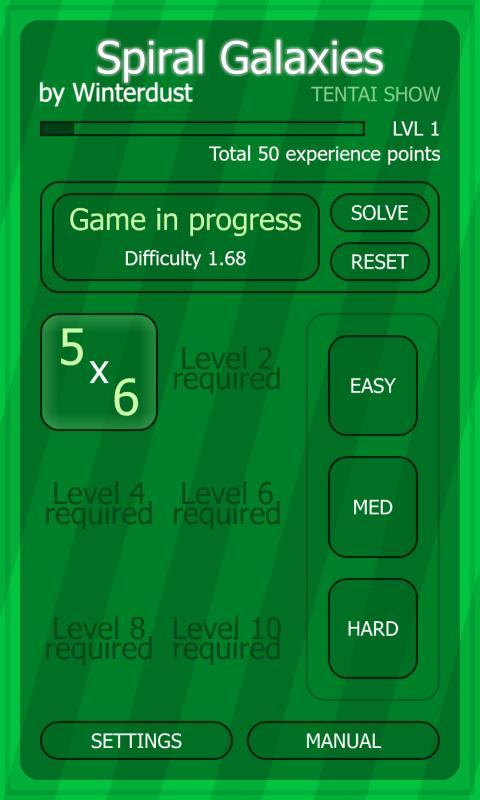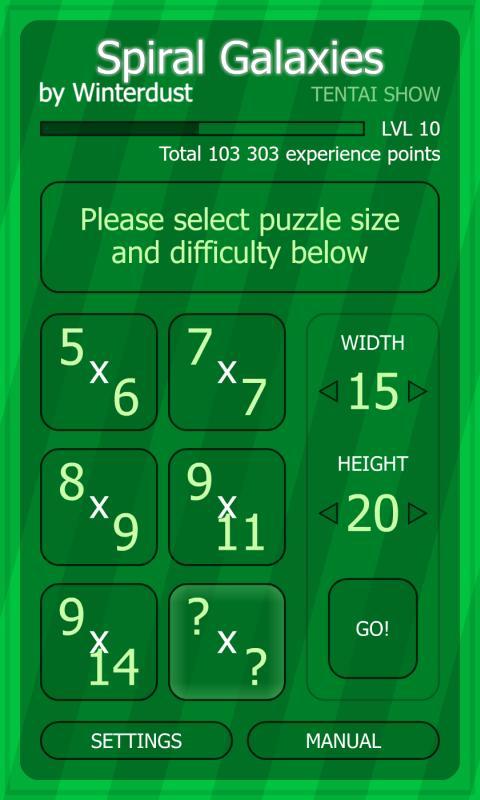 Les galaxies en spirale sont un puzzle où vous devez remplir un univers entier avec des galaxies. Au début du jeu, vous n'avez que les centres des galaxies, c'est à vous de les développer afin qu'ils prennent tout l'espace disponible.
