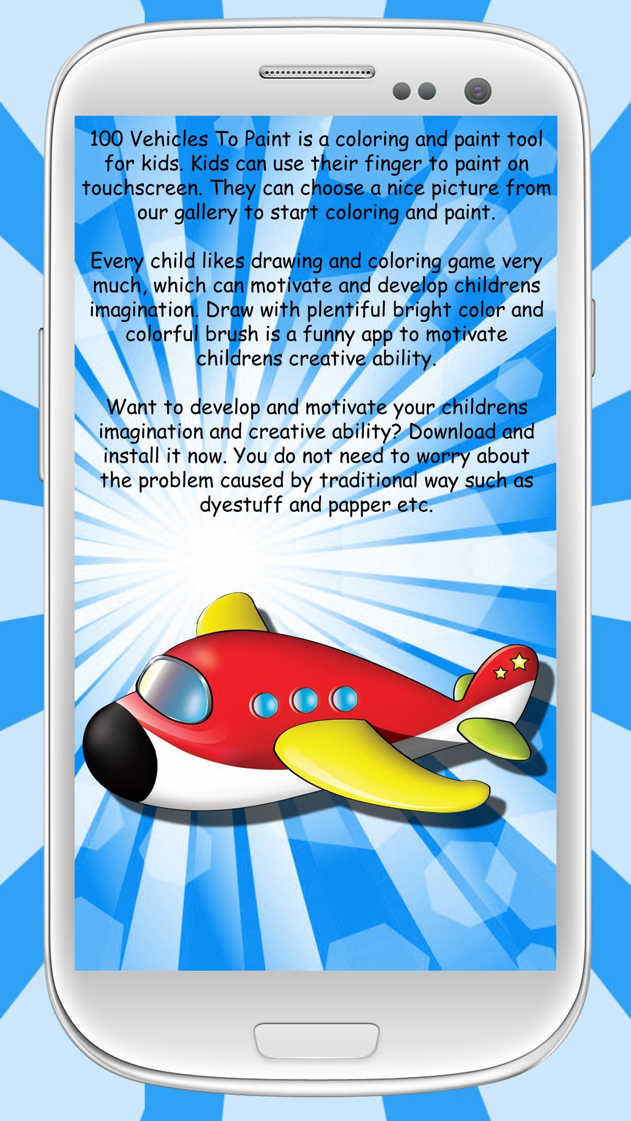 100 Vehicles To Paint is an entertaining application, easy to handle and in addition, serves to motivate the creative capacity of the children in any age. With this application the amusement for your children is guaranteed. A simple, design simple and exact to the capacities of the child allows to anyone handling it without any problem.
