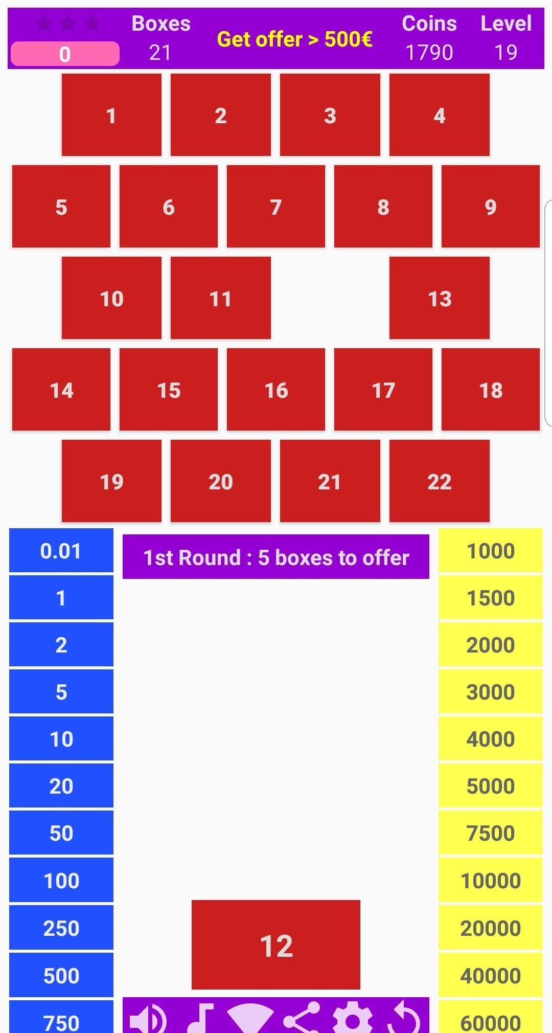 This application is based on the Deal Game and it is well known. The user must select a box out of 22. Each box contains a value from 0.01 to 60000. The user selects one by one witch boxes to reveal and tries to get the best offer from the banker, or holds his box until the end. The user that gets better deal than the content of his box is a winner.