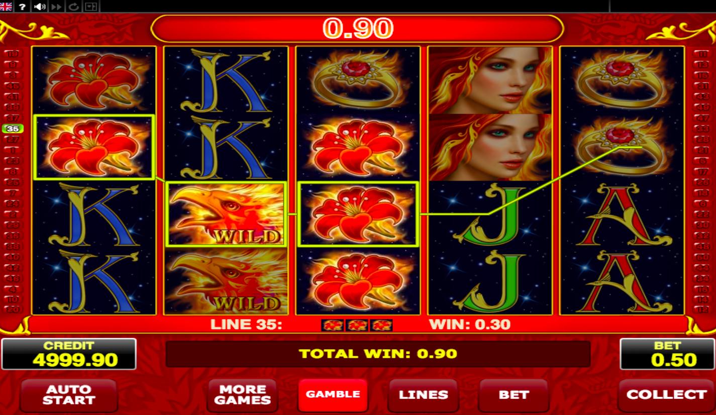 The Arising Phoenix slot from Our developers is dedicated to the famous bird that rises from its own ashes, so its design features everything that is related to the Phoenix. You can place bets on 50 payoff lines, which are formed across 5 reels with 4 rows each. The picture of a beautiful girl with flaming hair brings the highest payoffs if it occupies all cells on the gaming field. However, the most rewarding icon is the wild symbol which depicts the Phoenix with the “WILD” writing. If the wild symbol appears on any of the reels, a free bonus spin is launched instantly. During the spin, the reel with the wild symbol remains fixed, thus increasing the gambler’s chances to hit the jackpot.