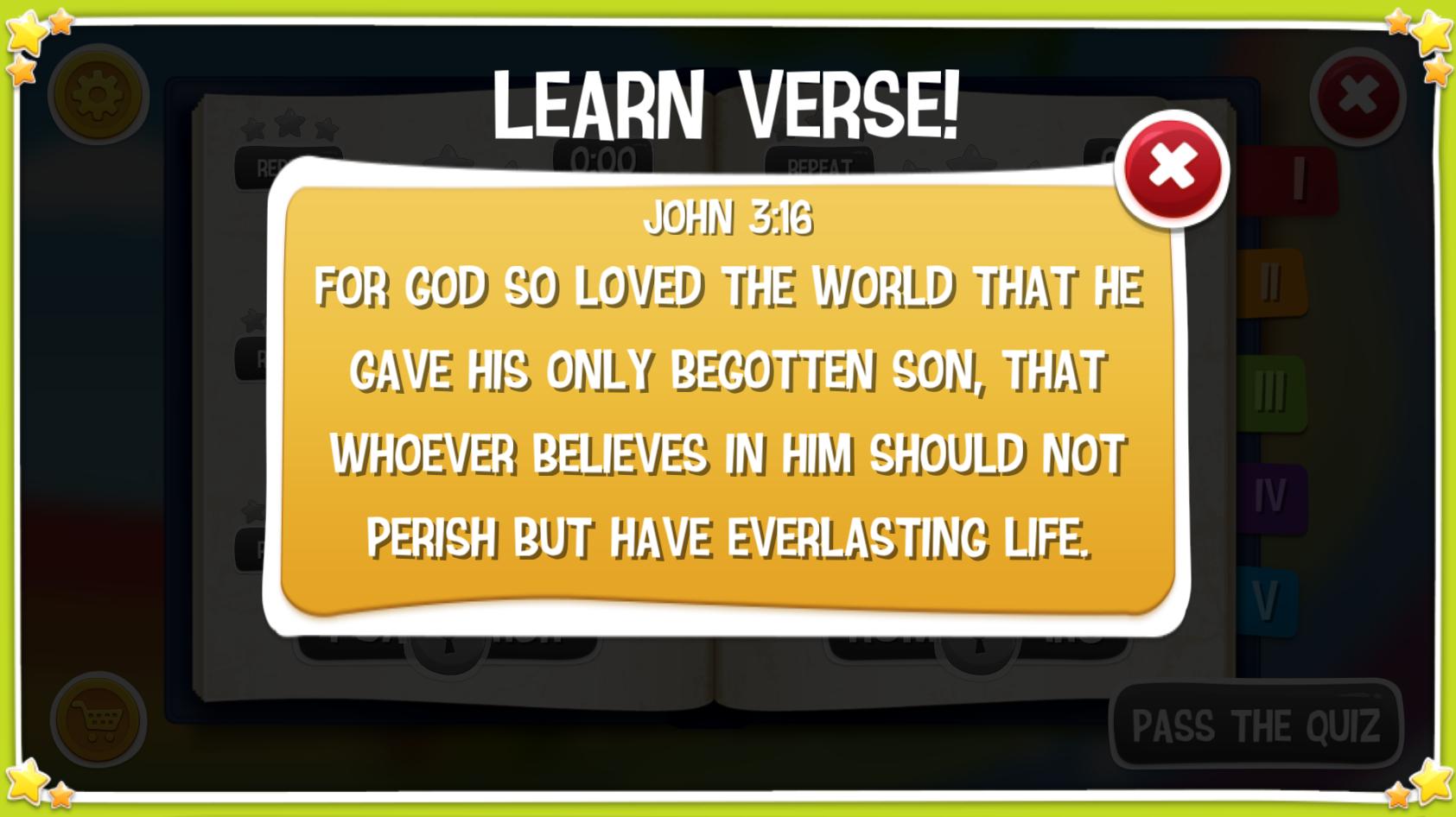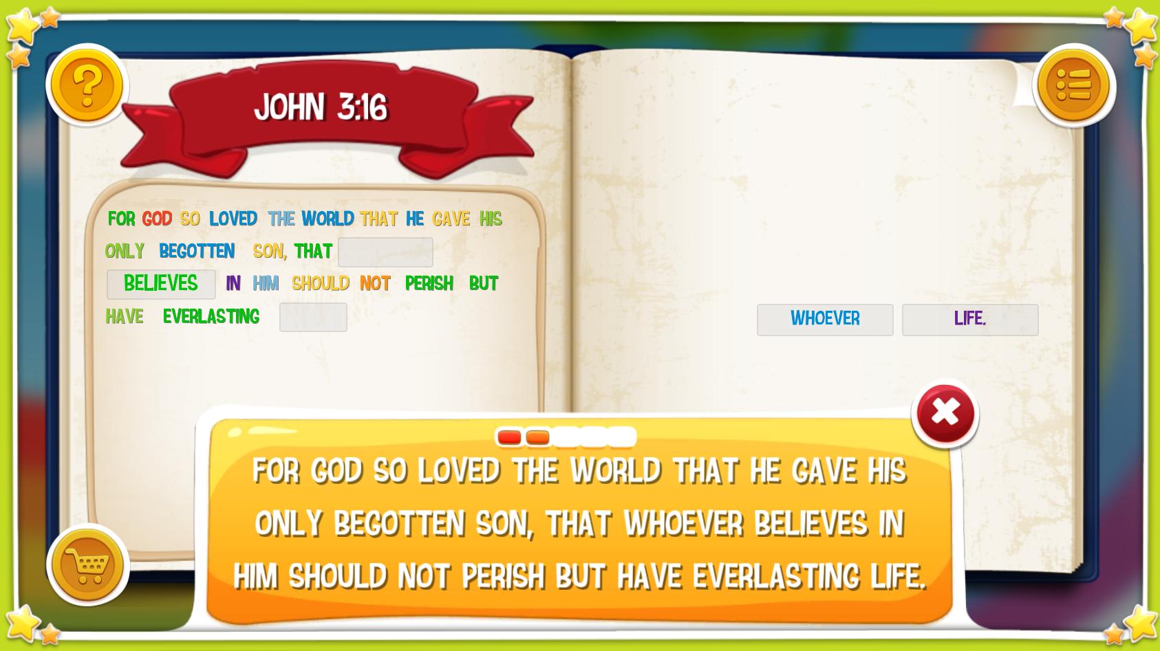 AwanaVerseFreeText is a game for children and their parents who want to learn Bible verses. The game helps to memorize Bible verses according to internetional Awana programme through various games. AwanaVerseFreeText is a game for children beginning at age 5. The first game from the series AwanaVerseFreeText is developed according to the Hedgehog Awana handbook. In the process of game children will help the main characters to gather Bible pages scattered by the wind, they'll do it by learning verses. After completing each level, opportunity to learn new verse opens.