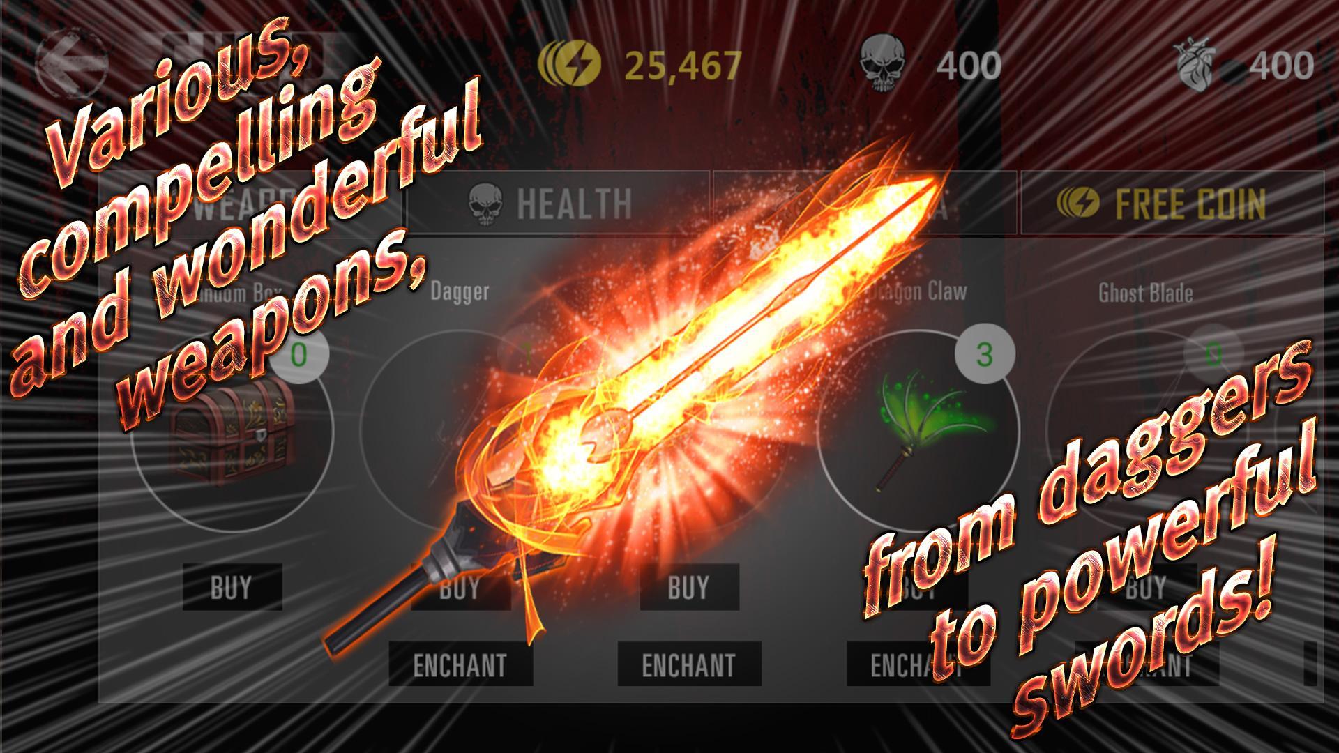 - In the shop, you can purchase a weapon to enchant and a random box, and upgrade stamina and health, and acquire free coin.