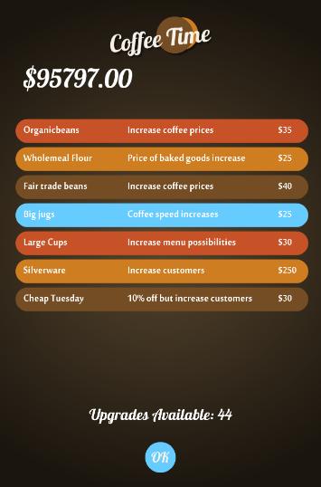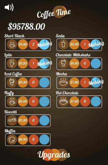 You are given a certain amount of cash boost to start up your own Coffee Shop. You then proceed to buy Coffee machines and other upgrades for the shop. While you progress through the game, you will get better prices, speedier service, automated work force to help you keep on top of the demand, and many other options.