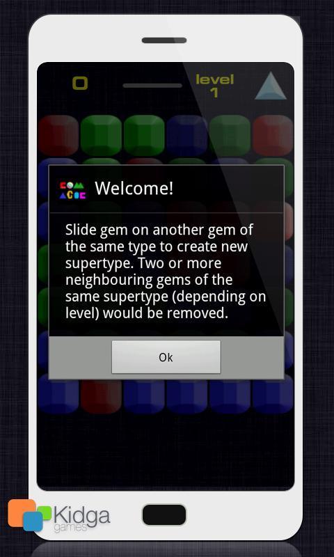 Train your logical thinking in a new fascinating game. Its something between match3 game and puzzle game. Slide gem on another gem of the same type to create new supertype. Two or more neighbouring gems of the same supertype (depending on level) would be removed.