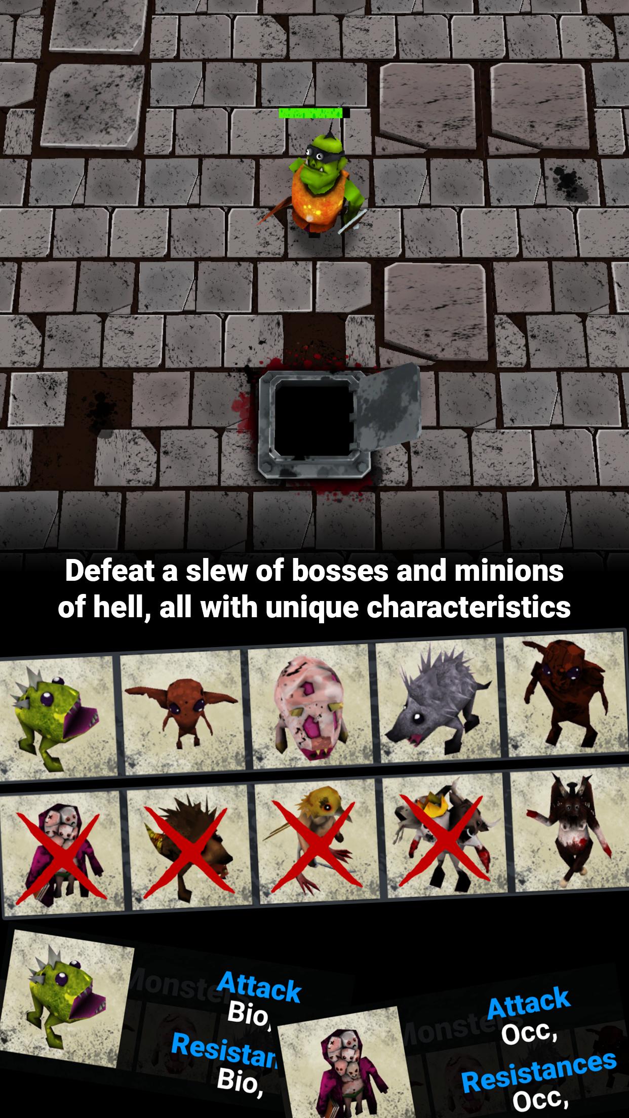 You direct Prototype X, a cybernetic orc, as he ventures through the 66.6 levels of hell to face off against the ultimate villain: Satahn. On the way you'll need to form a strategy and pick the right skills and items to support it.