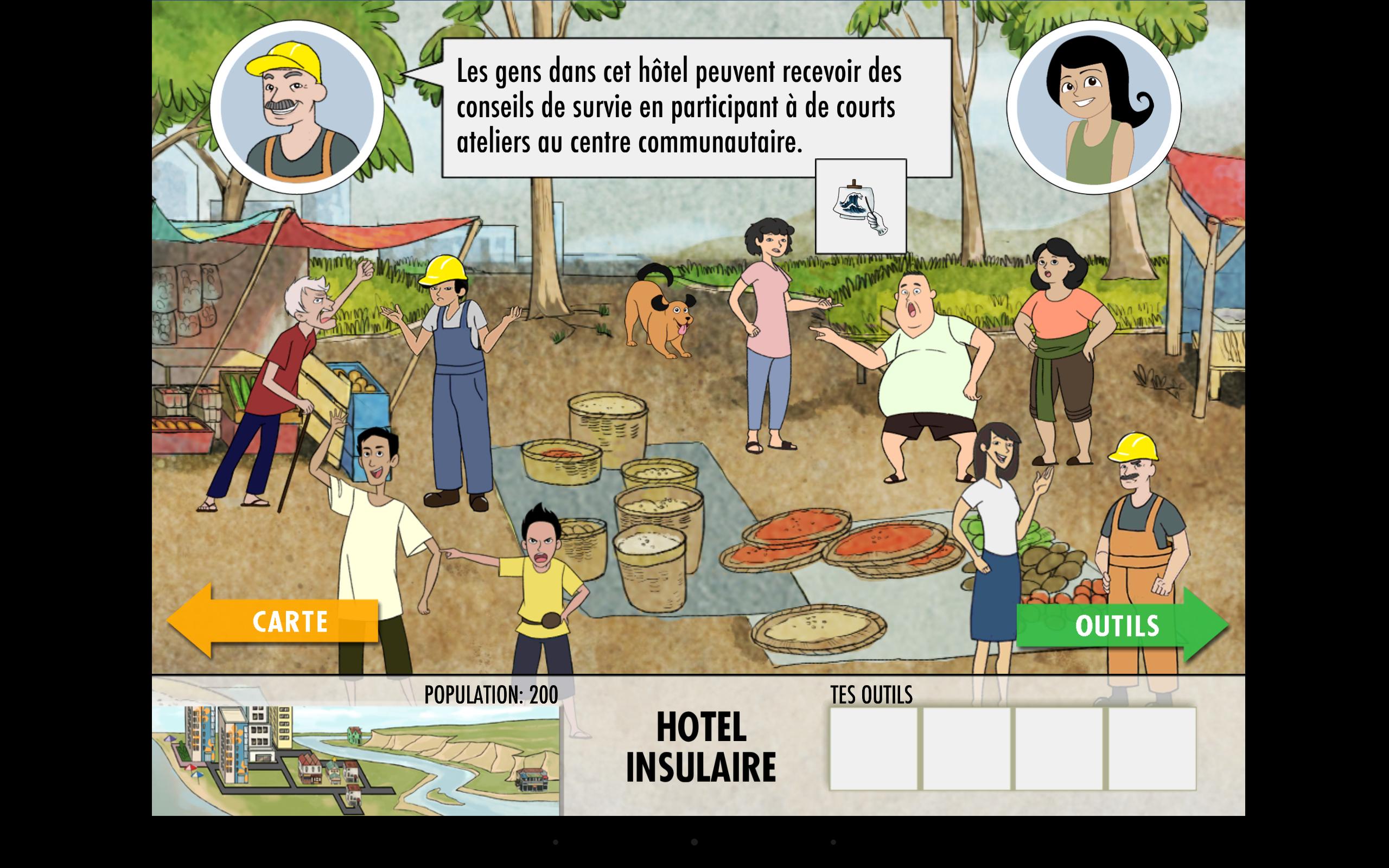 'Earth Girl 2: Preparing for tsunami' is an interactive fun game which consists in establishing strategies to increase the chances of survival in coastal communities in the event of an earthquake followed by a tsunami. The action takes place in four areas: the market, the card, the toolbox, and around twenty levels of play offering evacuation scenarios. The conviviality of the game encourages proactive exploration to discover these scenarios, while Earth Girl and the villagers provide knowledge, advice and comments throughout the game. Each level of play offers the possibility: to assimilate knowledge of the risk of tsunami by talking to market people, to choose tools according to a given budget, to explore the site where the site will take place and to Strategic according to the observations made, and to learn lessons by looking at the simulation. The level of success of players in this game depends on their level of interaction with the virtual community.