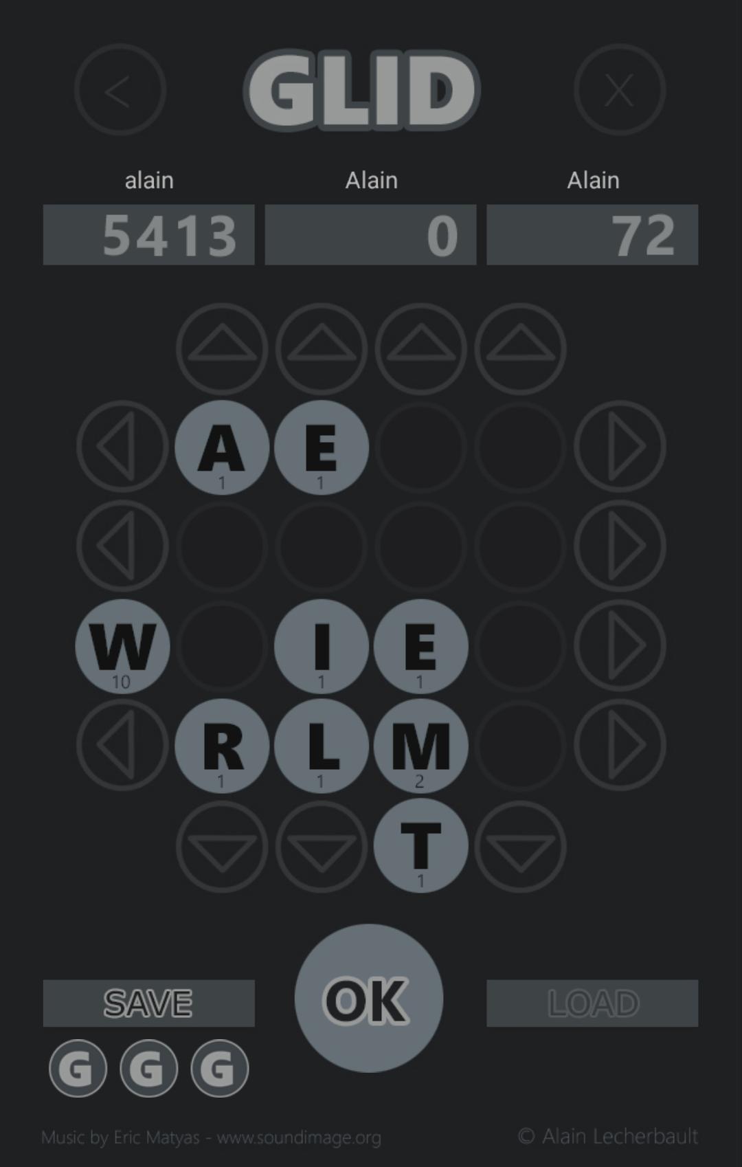 It is possible to save a part in progress associated with the existing pseudo. To do this, you have to click on the "Save" button and leave the game. At the next opening of the game, and if the pseudo entered is the same as during the saved part, Glid will offer you to restore it. Be careful, when you save a game and if you continue to play (validation of words) after clicking on "Save", Glid obviously erases the backup.