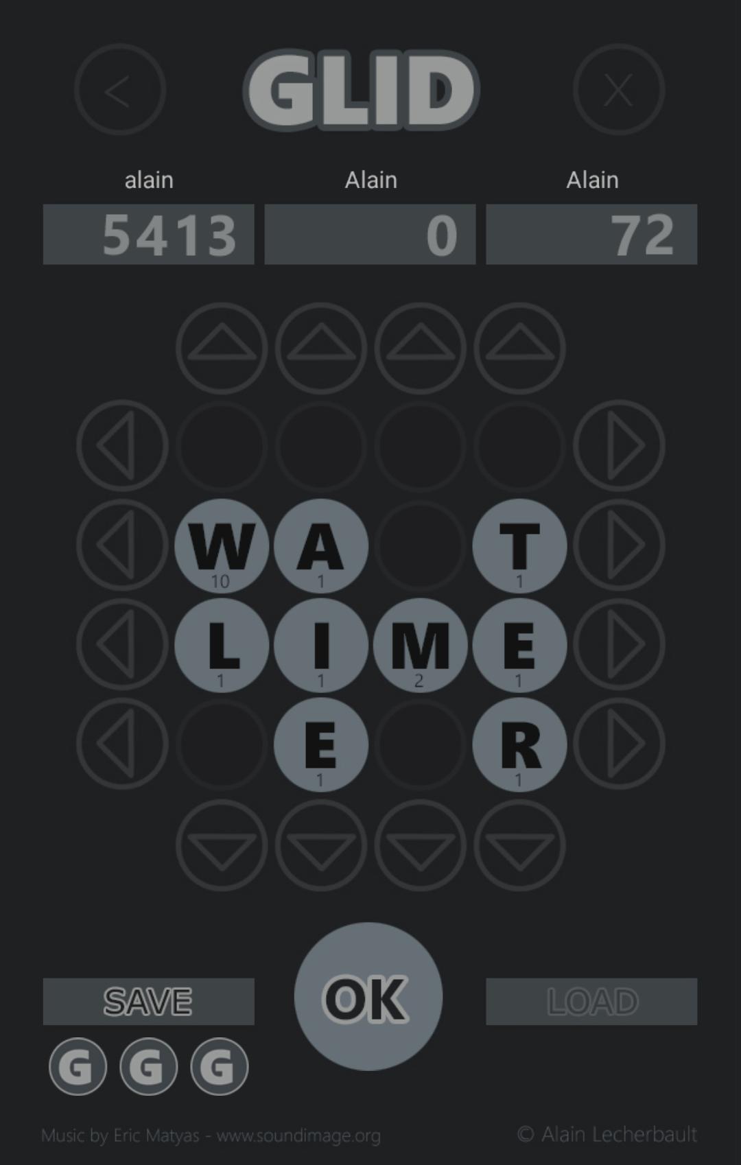 16 letters appear at the start of the game in a block of 4 x 4 letters. No horizontal or vertical word still exists in this initial block. It's up to you to create. To do this, you need to move the horizontal or vertical lines by clicking on the arrow keys appearing at each end. The whole line moves from box to box, including spaces later left empty. When you want to validate one or more words created, you need to click on the OK button on the game. Glid then scores all the horizontal and vertical lines of the playground and makes all the words that its dictionary recognizes, adding to the score the points acquired during this maneuver.
