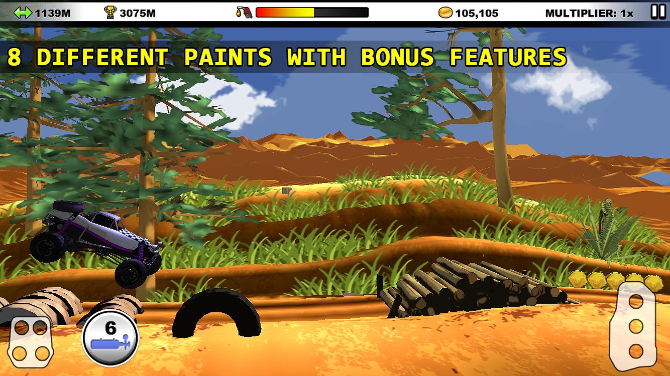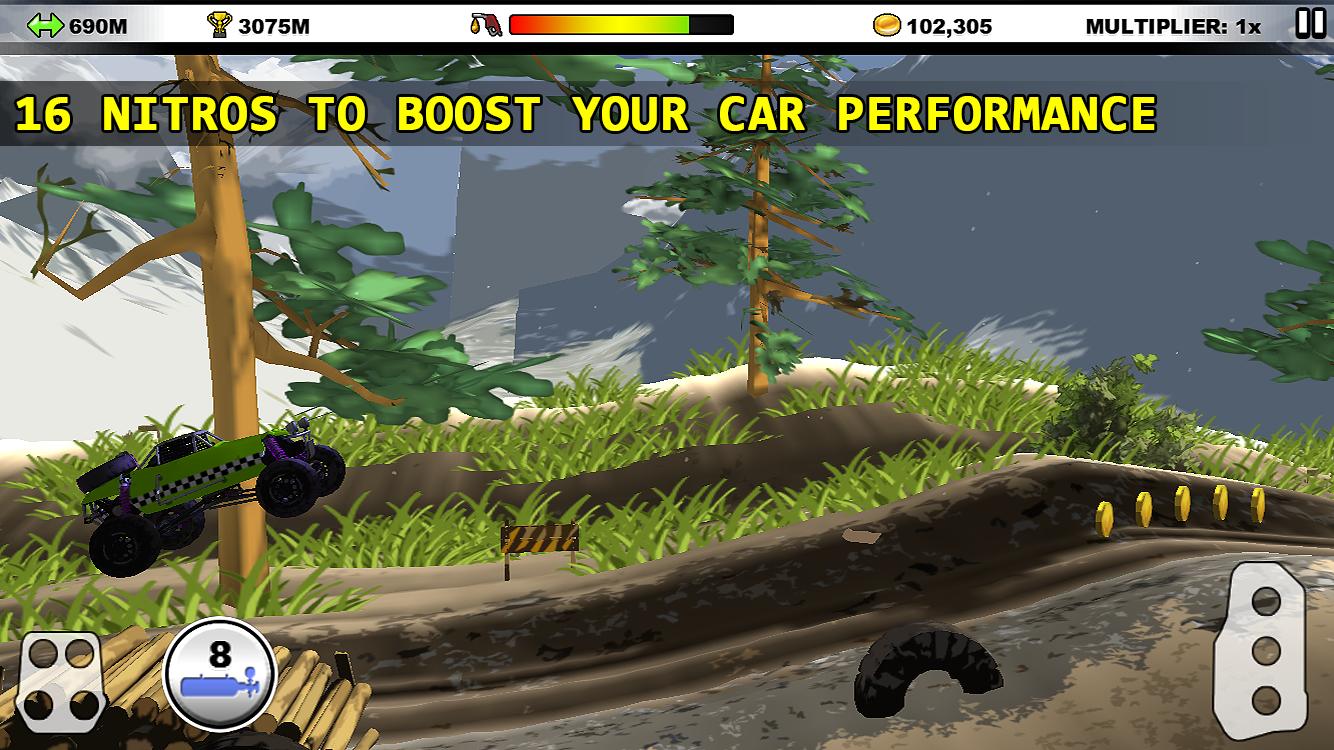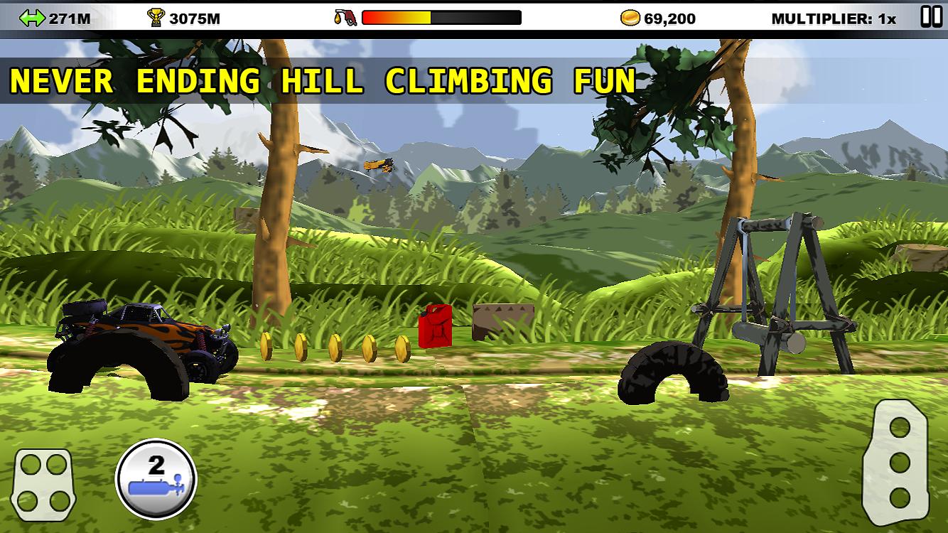 Let's face challenges of endless hill climb action. Collect coins and tuning your car. The more distance you take, the more coins can be collected. Spend these coins to purchase upgrades for your car, so you will be able to reach higher distance. Don't forget to change painting of your car. The different paints give various boost to your car. Feel free to change between them race by race. Repeatedly check the fuel indicator while racing because out of fuel causes end of the game.