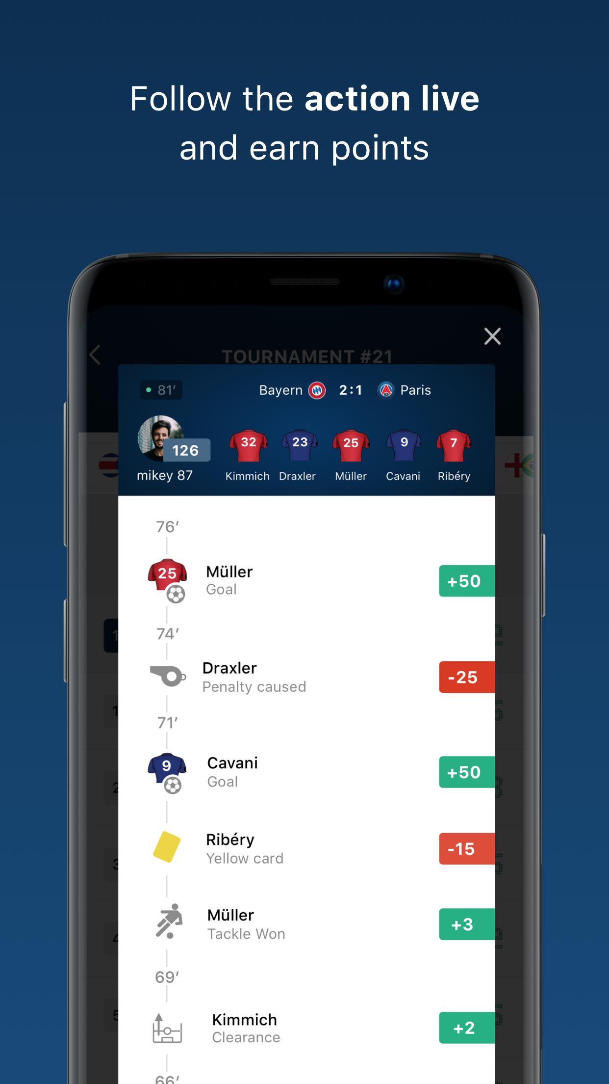 All you need to do is pick the five best performing players of a match to rack up as many points as possible. Your players' real performance throughout the match determines your score and you can follow it live, play by play, minute by minute, with our Live Ticker - don't miss out on any action!