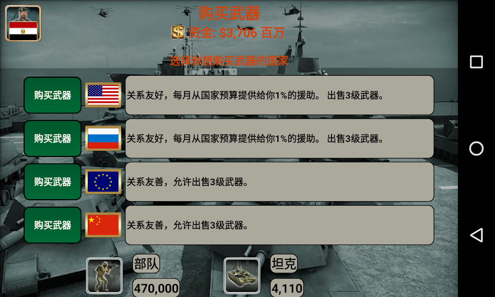 Lead your armies with Troops, Tanks, Artillery, Anti-Air Missiles, Helicopters, Multi-role combat aircraft, Battle Ships, Submarines, and Ballistic Missiles.