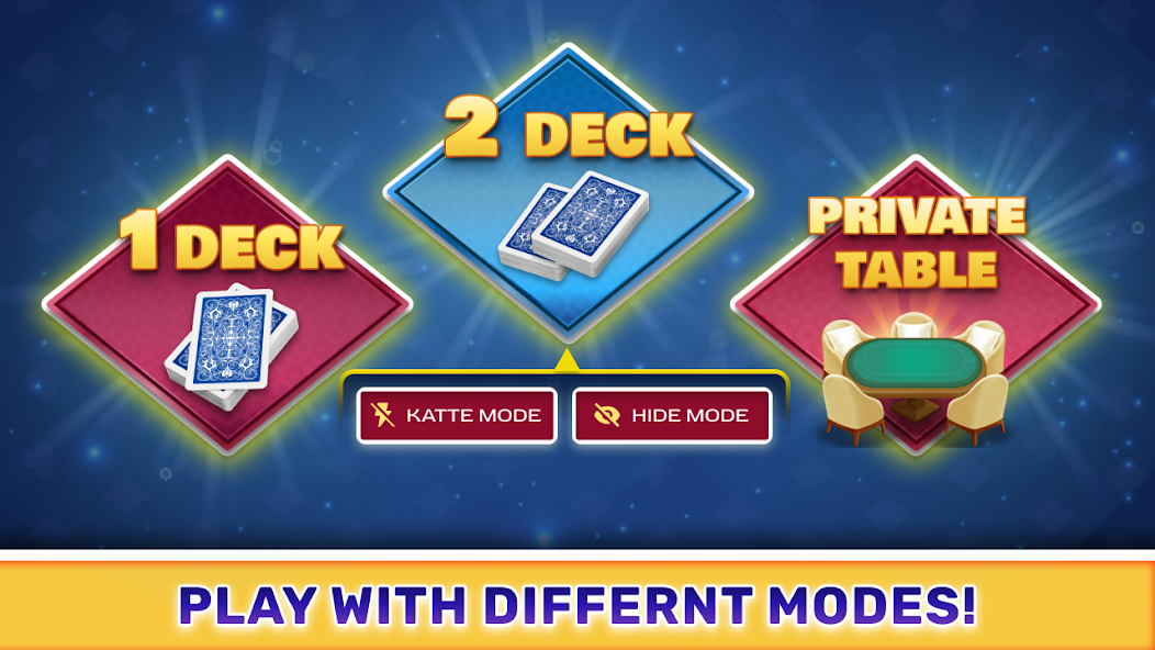 - The declaration of trump depends on the mode of the game. If you are playing "Hide mode" then you need to face up a card that was face down at the time of dealing and whatever a suit will be in a card is considered as trump.