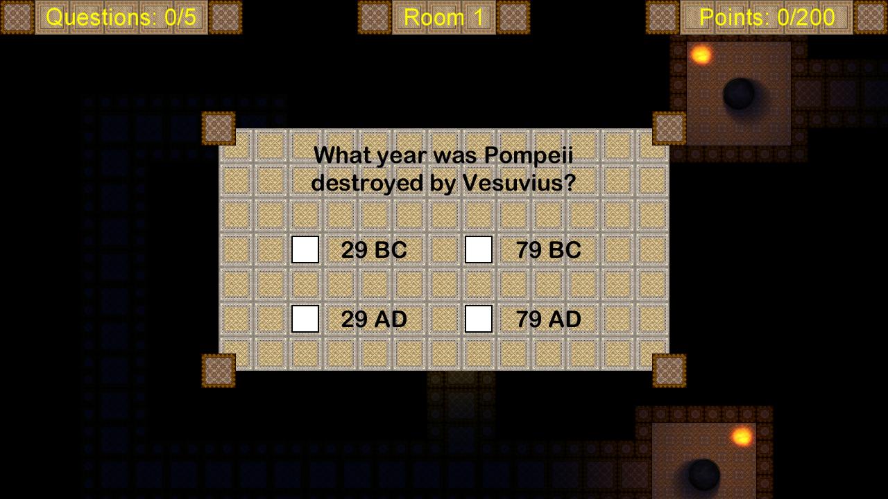 Explore spooky rooms, avoid drones, answer the questions correctly to open doors