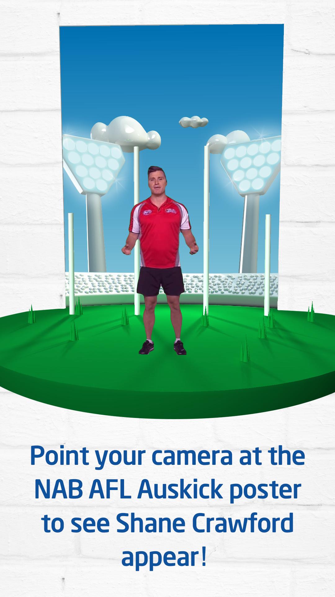 NAB AFL Auskick Central app is an augmented reality app that transforms your NAB AFL Auskick poster into a stage for Shane Crawford! See Shane Crawford come to life on your screen to tell you all about the NAB AFL Auskick program and how you can get involved, plus play our kicking game to see how many goals you can score! Simply download the app and point your camera at the NAB AFL Auskick poster to see the augmented reality app come to life!