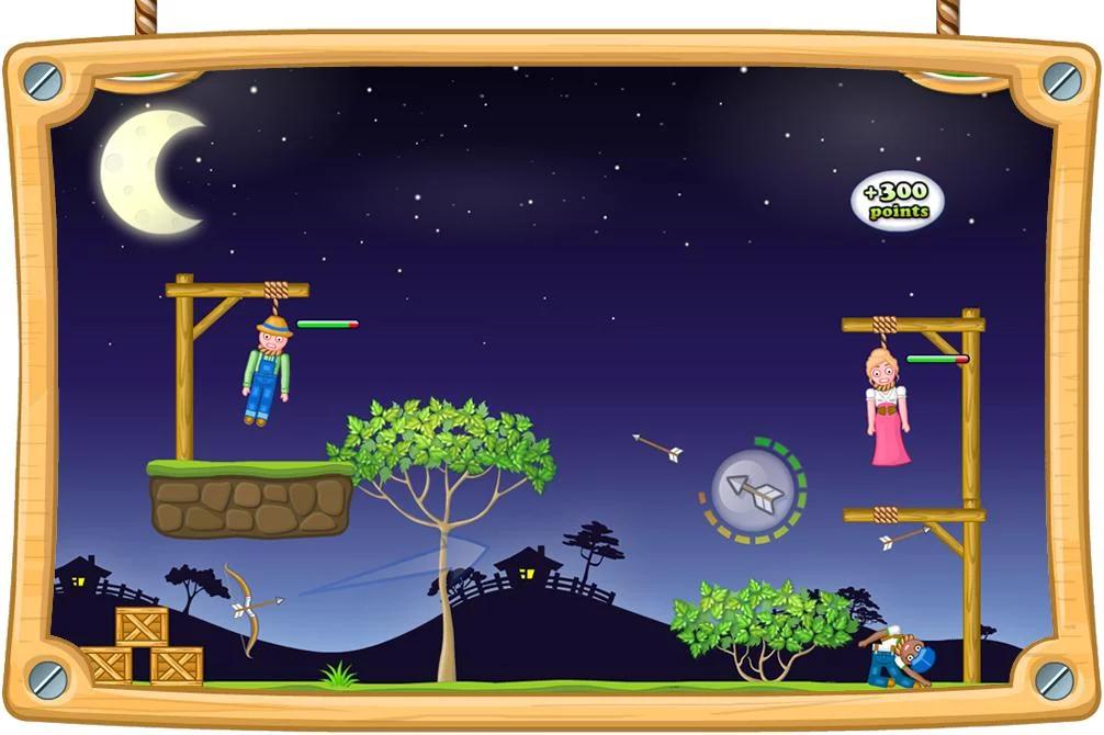 One of the villagers were invaded by some unkown guys and they kidnapped the innocent villagers,threatened that if we didn't go there to rescue them,those villagers will be dead in no time. The only way to rescue there would be by shooting the rope.There's no way that you can get any closer,the only weapon you have is the bow you practise every day. You have to save those innocent people by shooting the rope and not hurting them. Remeber, if you missed the shoot, you might kill the victims instead of rescuing them. You might need to make use of some items to reach the goal,the gas barrel and tnt barrel could explode and destroy other items around it.The magnet could drag your arrows towards it.And some arrow has variable shooting force,so you have to shoot at the right time.