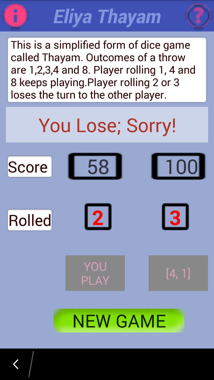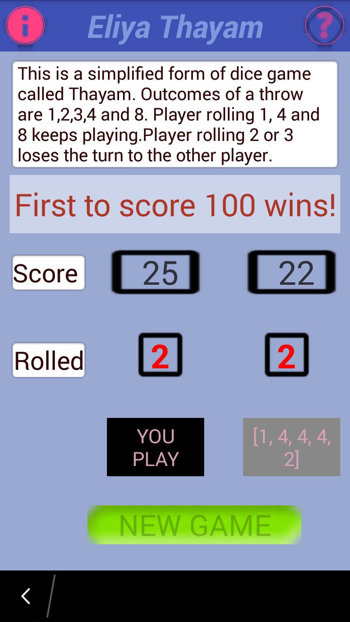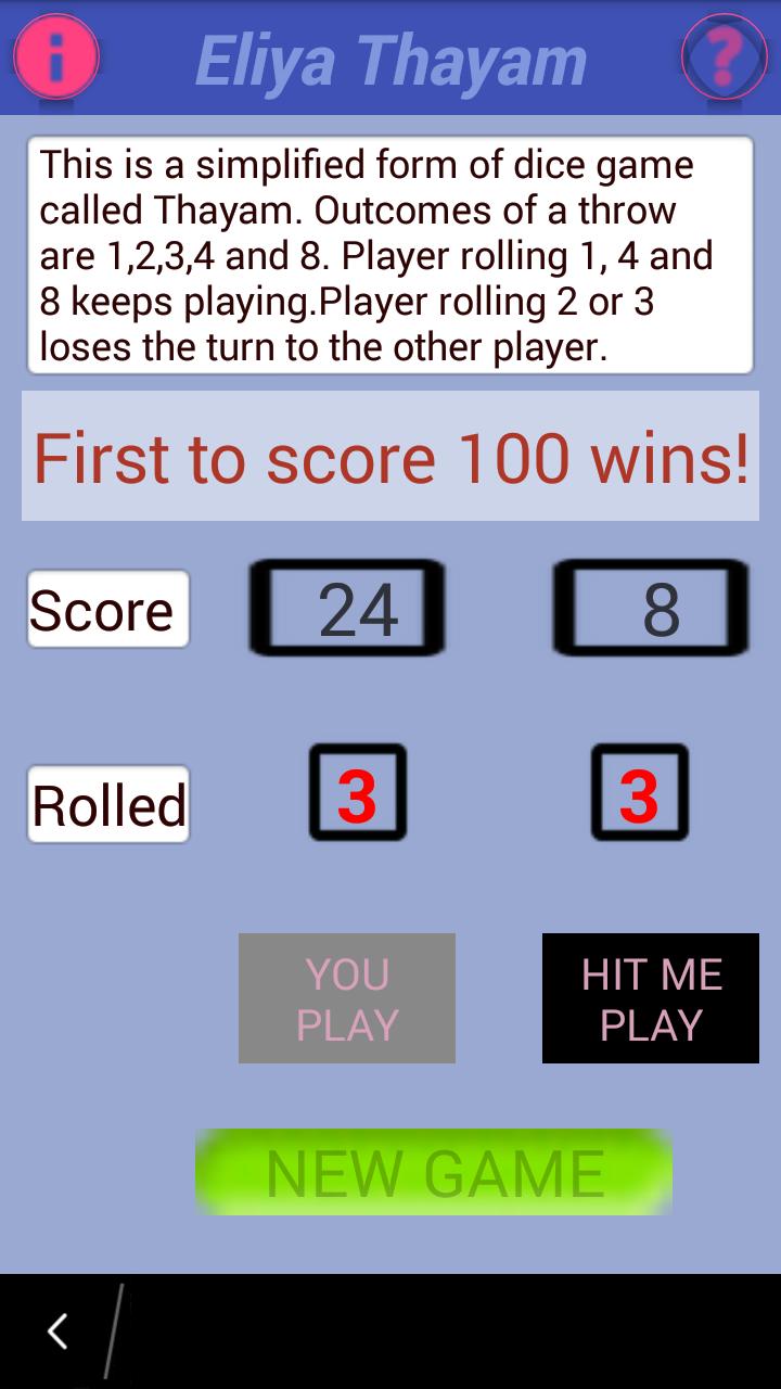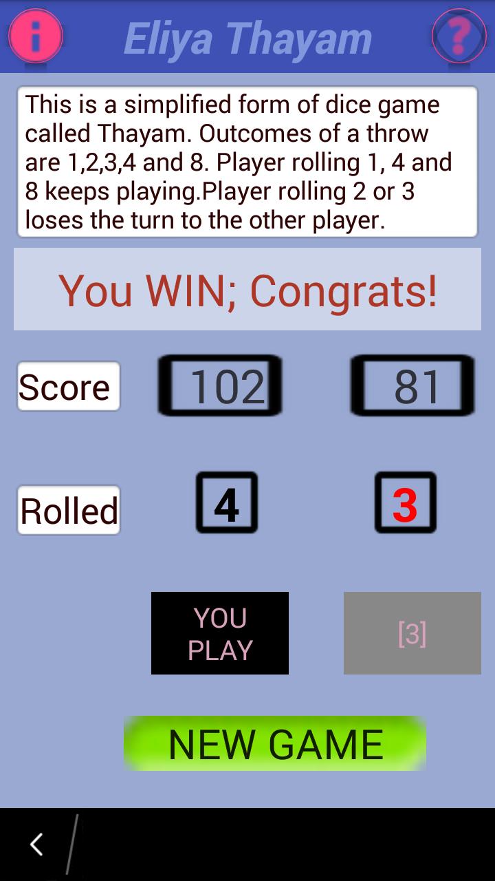 The ancient game Thayam is supposed to be played as a board game with dice rolled. For simplicity to users enjoy the game, it is made without the board and the dice shown.
