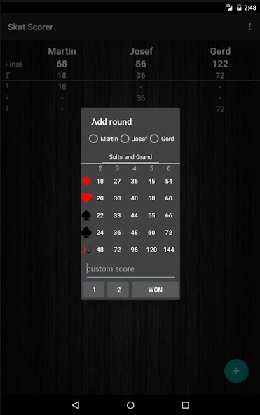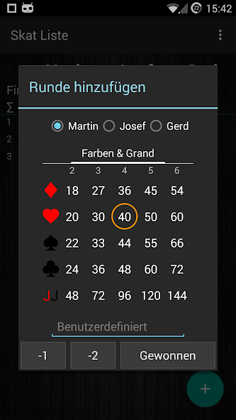Skat Scorer helps you to keep the score list of your skat match. Moreover, the score sum and the final score (Fabian Seeger) of each player are shown permanently.