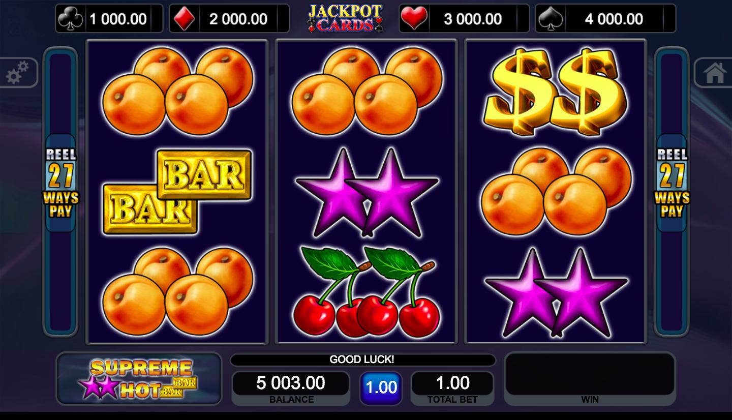 The Supreme Hot gaming machine with 3 reels invites you to meet with classic one-armed bandits. The most awaited prize is the progressive jackpot. It can be won in a special round where you need to flip three cards of the same suit. Each spin in the main mode can bring up to 1,000 credits. The payouts can be increased in a risk game.