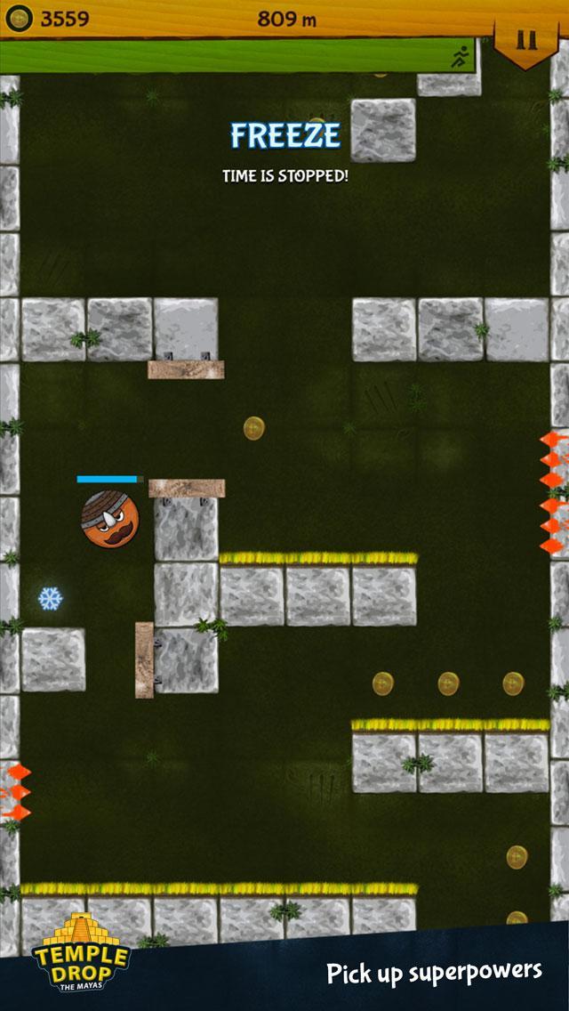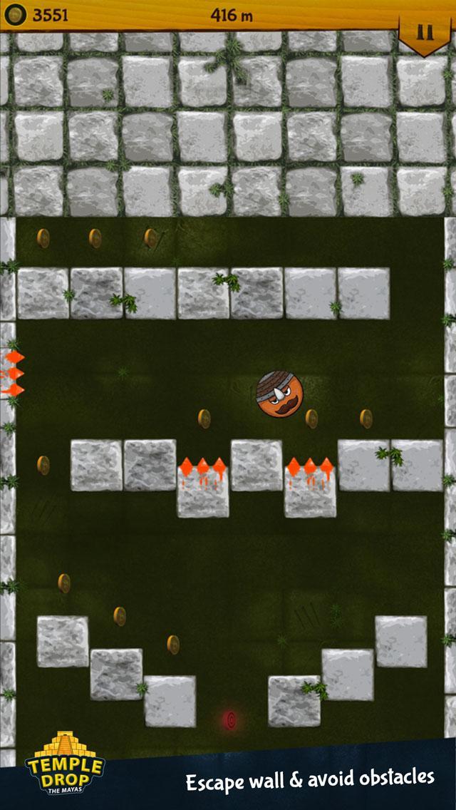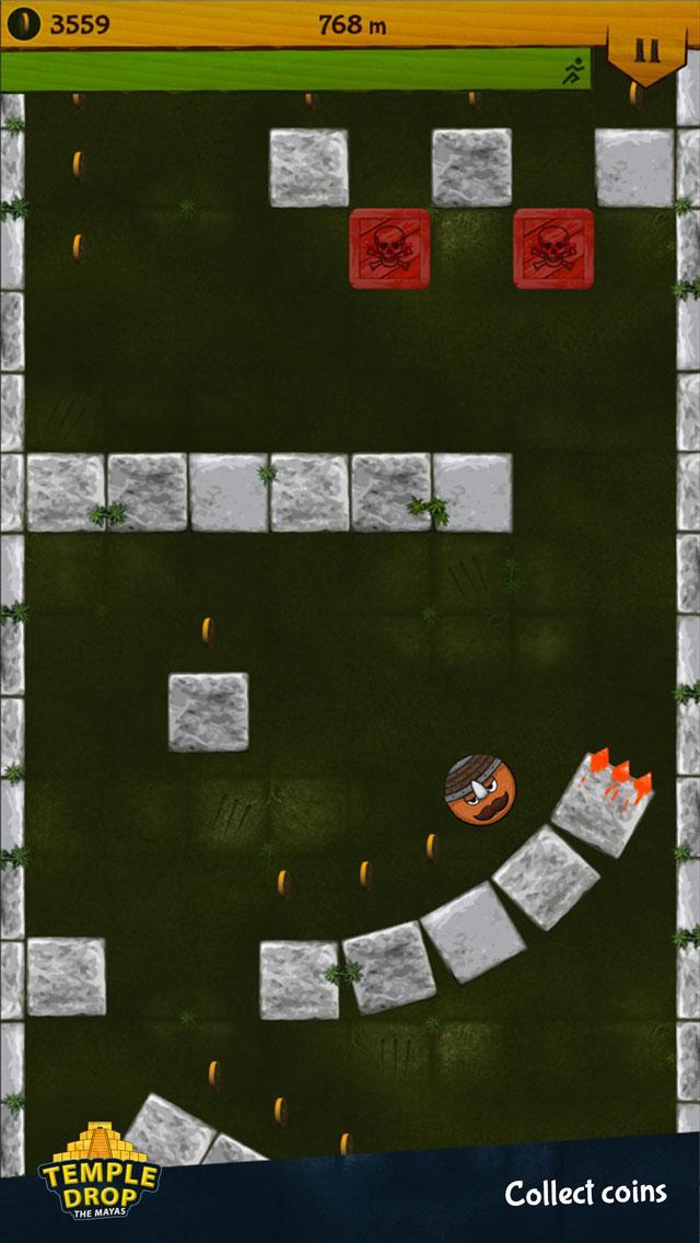 Temple Drop is a simple one touch/swipe game. In this crazy adventure, your task is to help mini Mayans fall as fast as possible while avoiding obstacles. On your quest you will find bombs, spikes, superpowers but most importantly - GOLD. With gold you can upgrade your superpowers and unlock new characters. Freeze time, wear shield or smash stones, but remember, escape from chasing wall. When ready, unlock all achievements. Share crazy moments with Everyplay gameplay recording feature.