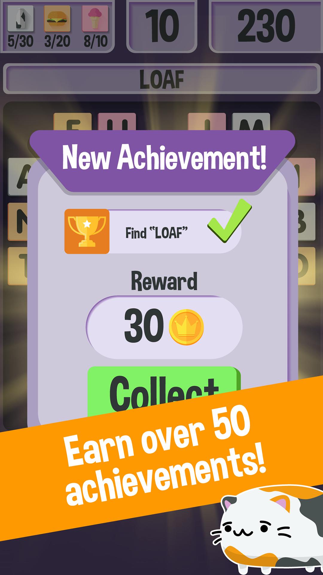 Word Quest Kitty Crave Saga is a cute and comical word game about a cat who loves food! Help Mr. Loaf on his quest to find tasty and delicious words! Collect Milk, Burger, and Ice Cream tiles to keep him fat and happy. Use boosters to help him collect those savory treats!