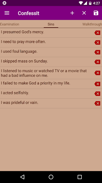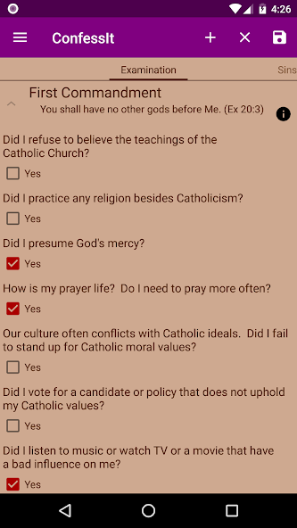 ConfessIt adalah ujian Katolik Roma dari aplikasi hati nurani untuk perangkat Android Anda. Ini dirancang untuk menjadi sederhana dan mudah digunakan, dan itu akan membantu Anda mengingat dosa Anda untuk pengakuan. Ada juga walkthrough pengakuan yang memberi tahu Anda dengan tepat apa yang akan dikatakan pengakuan Anda dan bagaimana Anda harus merespons. Pemeriksaan hati nurani didasarkan pada ajaran Gereja Katolik yang mendasar, mudah dimengerti, dan relevan untuk umat Katolik modern.