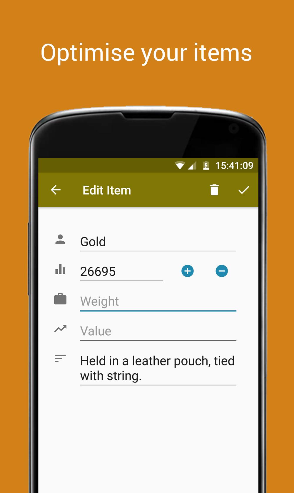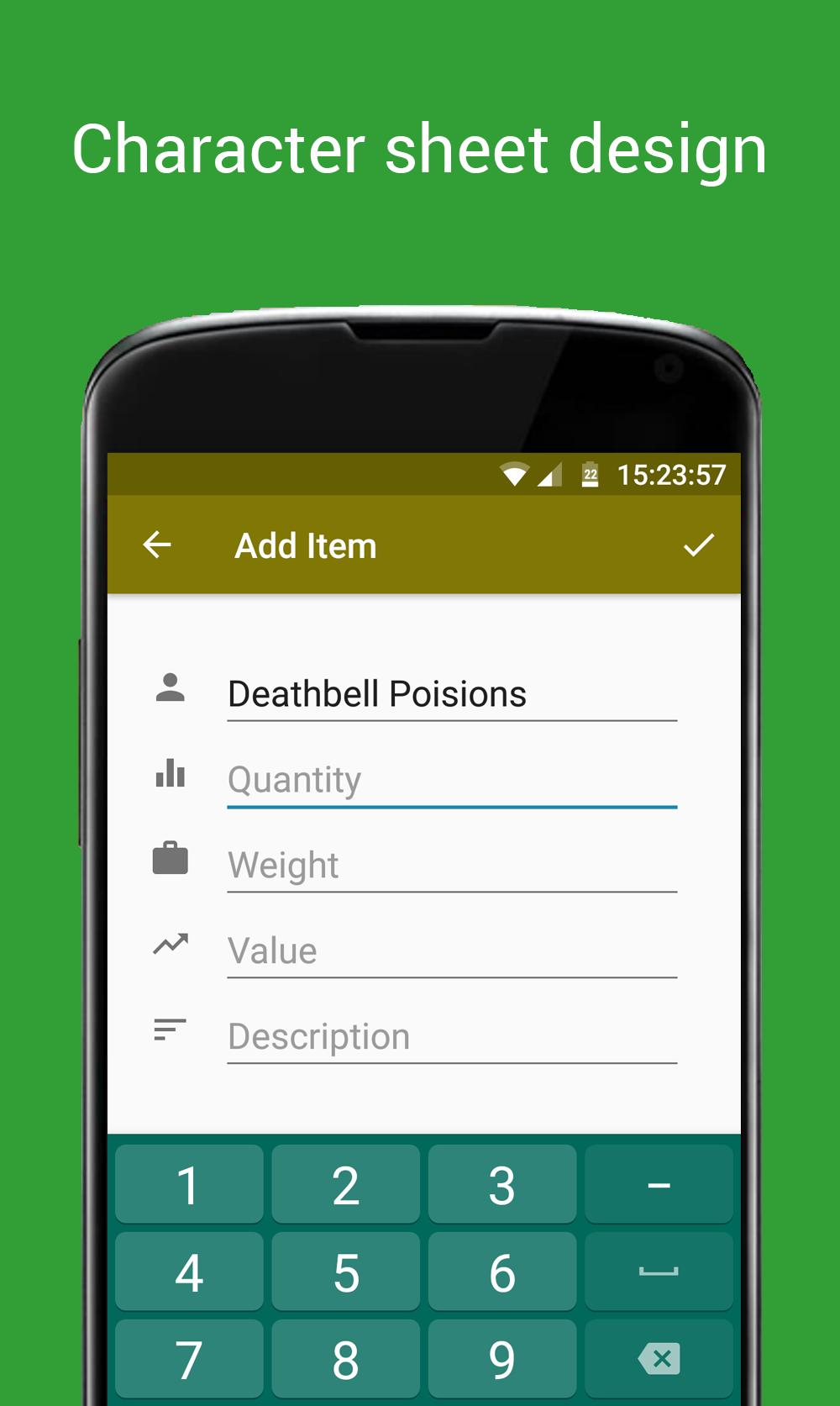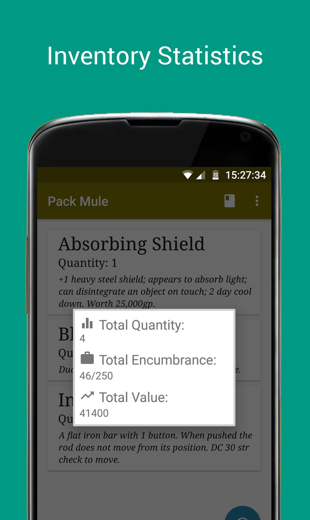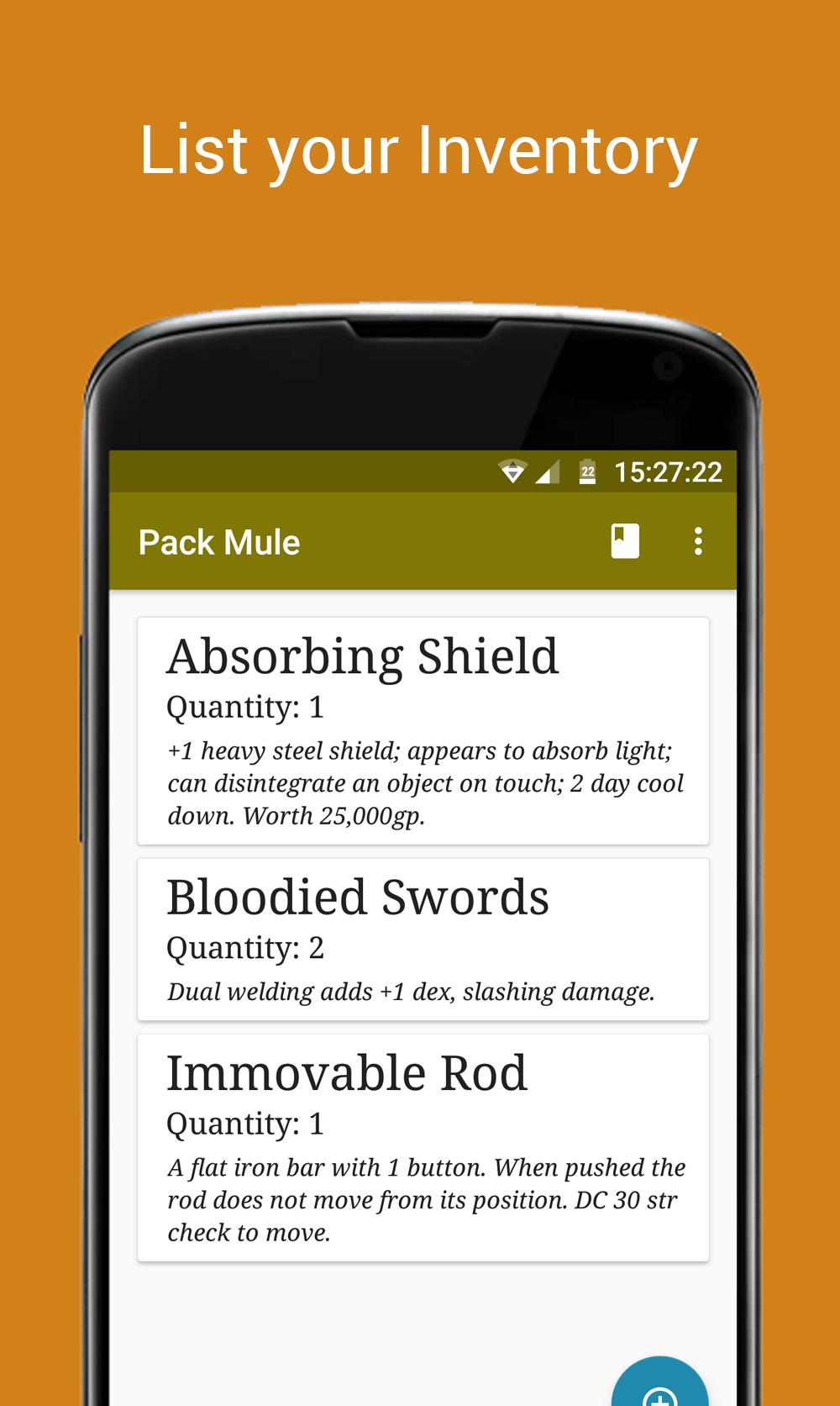 Dengan mengadaptasi gaya inventaris yang dicoba dan tepercaya hanya dengan menulis nama, kuantitas, dan deskripsi - ruang bawah tanah dan naga Anda, Pathfinder atau permainan permainan peran lainnya akan memiliki inventaris yang mudah, Anda tidak akan pernah kembali ke pena dan kertas.