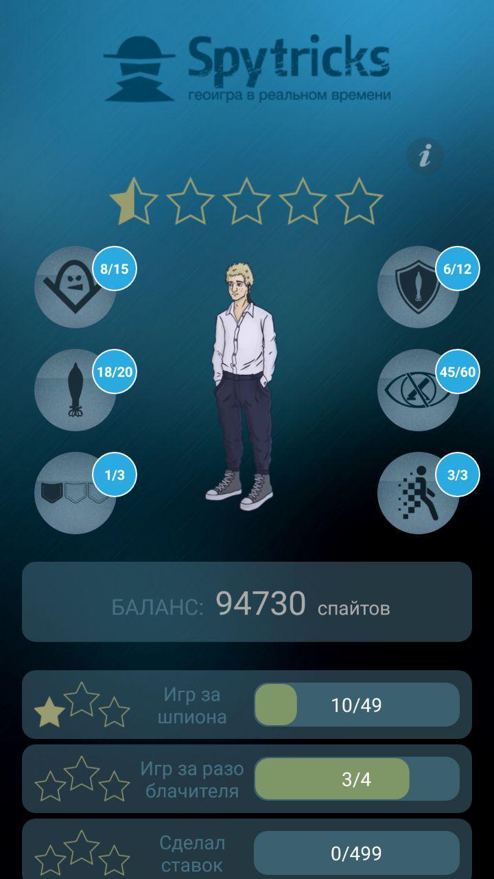 スパイのゲームを開始するには、ゲームのパラメーター(条件)を指定する必要があります。これは、追跡者の最大数、レート、およびエクスポージャーが含める必要があります。 4番目のパラメーターは、スパイが追跡者を離れなければならない時間です。選択する時間が長いほど、アーティファクトを拾うために行く必要があるタスクに距離が少なくなります。 15分を選択するときは、展示されたアーティファクトに1 kmを克服する必要があります。 30分は、距離を750メートルのアーティファクトまで制限します。 1時間のパラメーターを選択すると、アーティファクトまでの距離は500メートルに減少します。